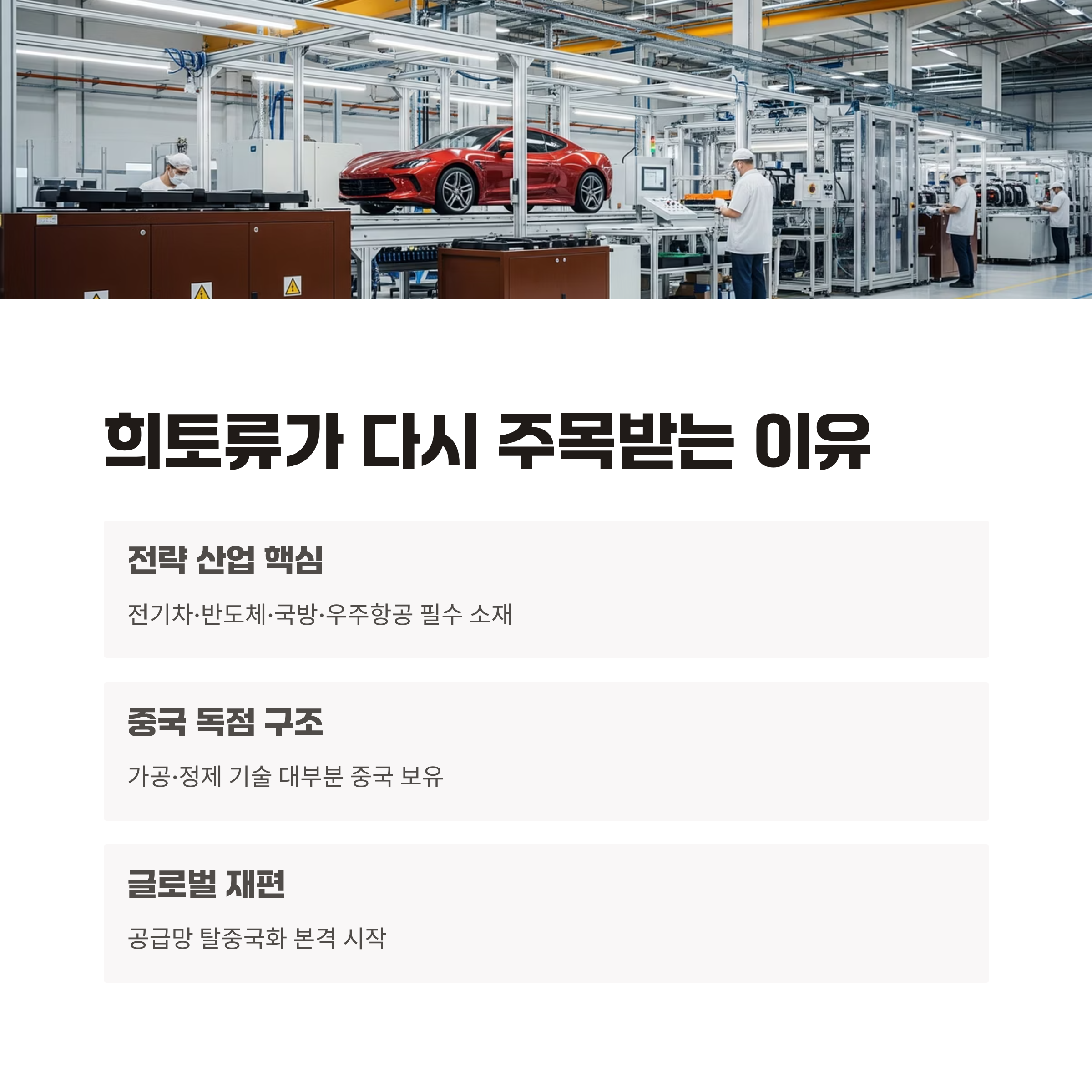 미중 갈등이 격화되면서 '희토류'가 다시 주목받고 있습니다. 단순한 원자재가 아니라, 전기차·반도체·국방·우주항공 등 전략 산업의 핵심 소재로 떠오르고 있기 때문이죠. 특히 희토류 가공·정제 기술을 대부분 중국이 쥐고 있어, 이 공급망을 벗어나려는 글로벌 움직임이 투자자들에겐 중요한 기회로 작용하고 있습니다.
