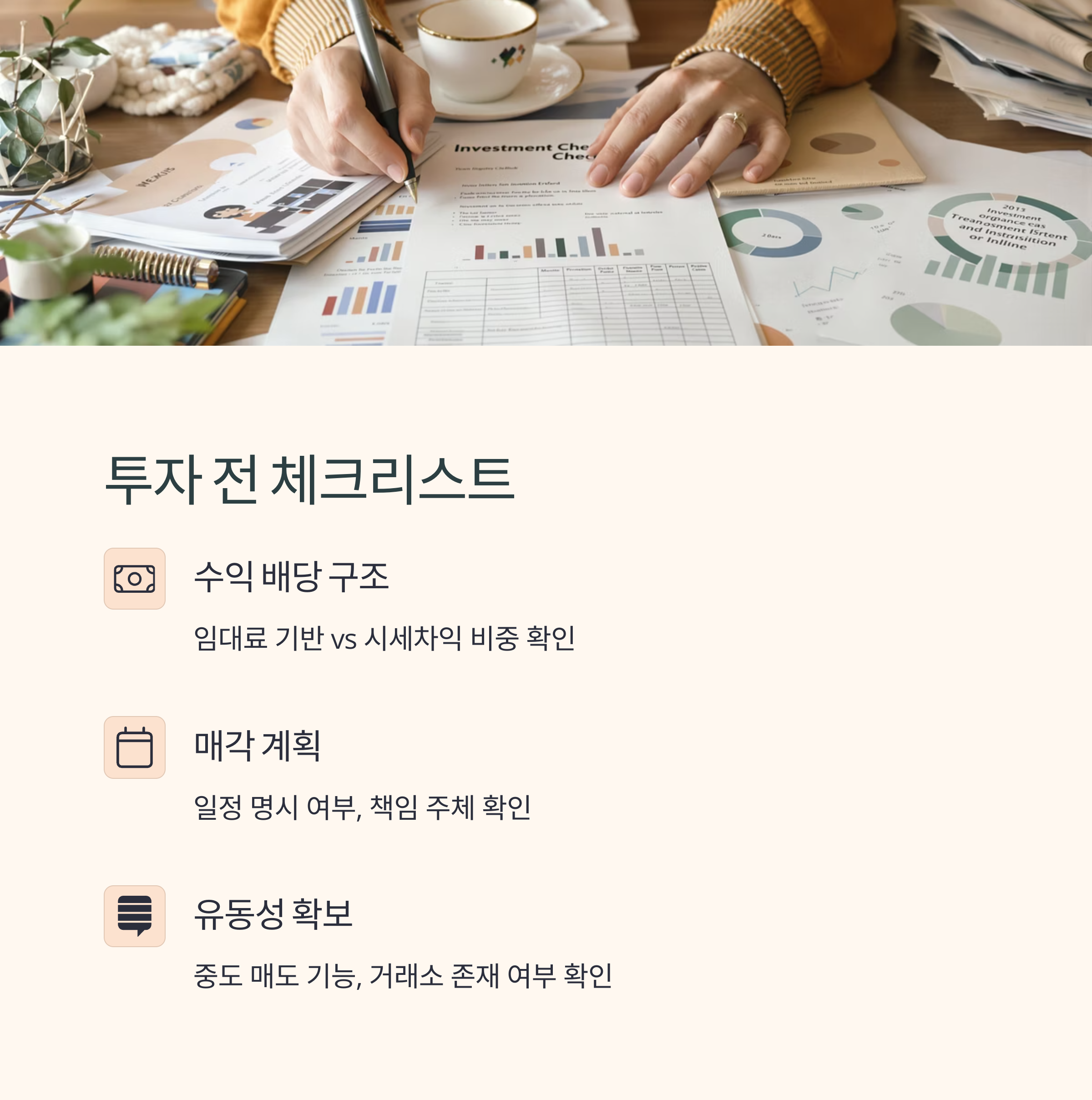 | 수익 배당 구조 | 임대료 기반 vs 시세차익 비중 |