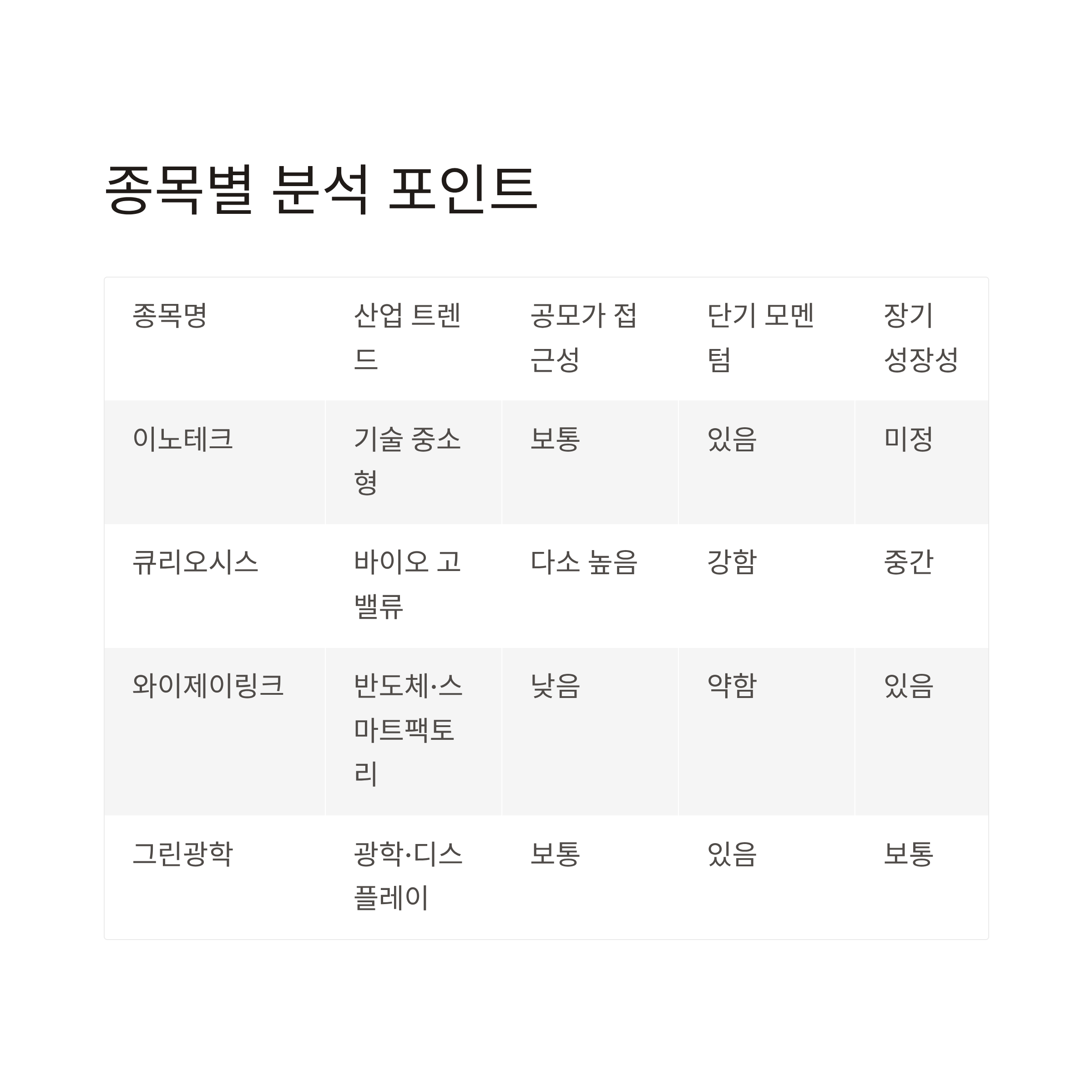 종목명 산업 트렌드 연계성 공모가 접근성 단기 모멘텀 장기 성장성 체크포인트