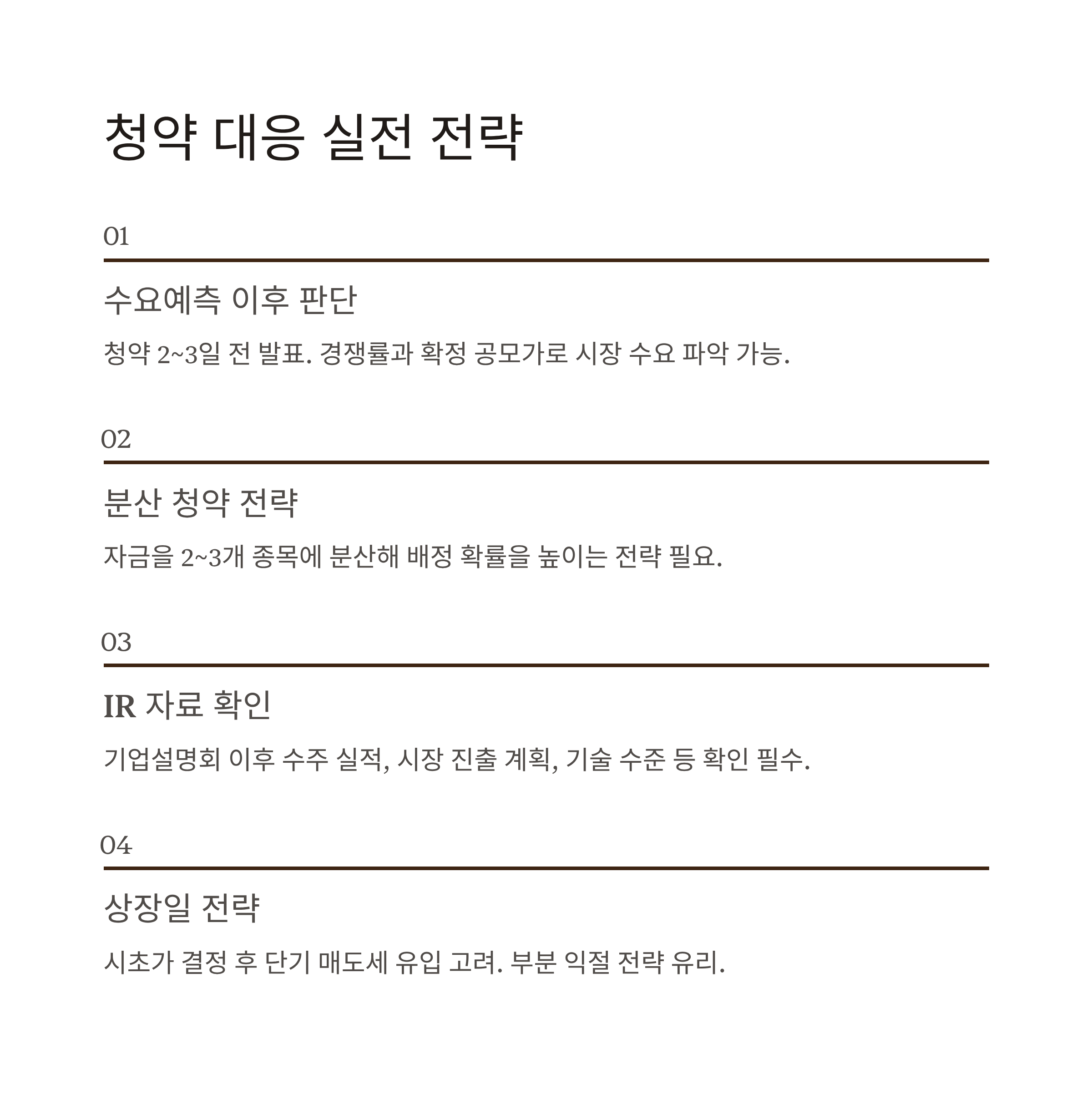 또한 IR 자료를 통한 실적, 수주, 성장 전략 확인이 중요하며, 상장 당일 이후 흐름까지 염두에 둔 매도 전략을 함께 세워두면 수익률 방어에 유리합니다.