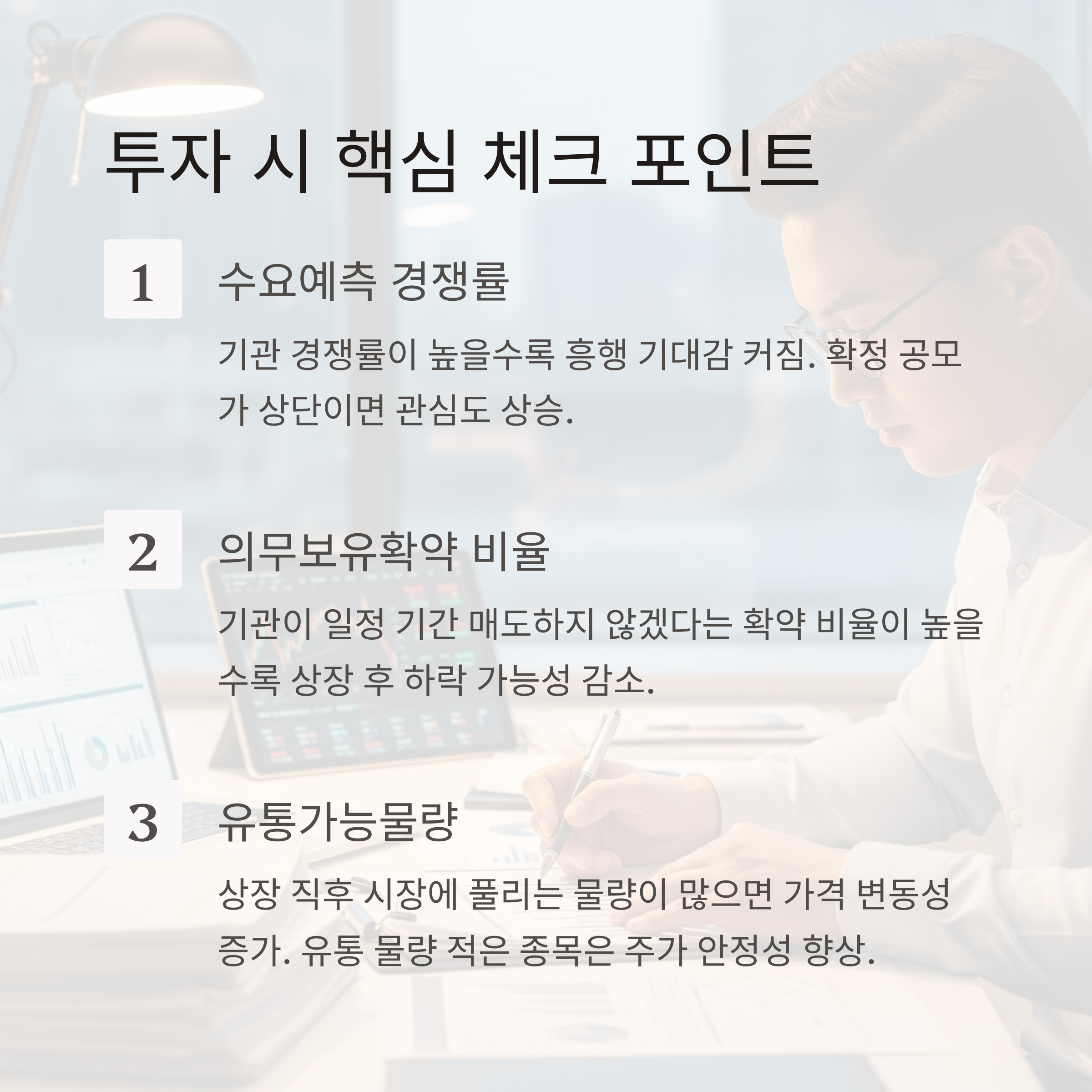 | 의무보유확약 비율 | 기관이 일정 기간 주식을 매도하지 않겠다는 확약 비율이 높을수록 상장 후 하락 가능성 ↓ |