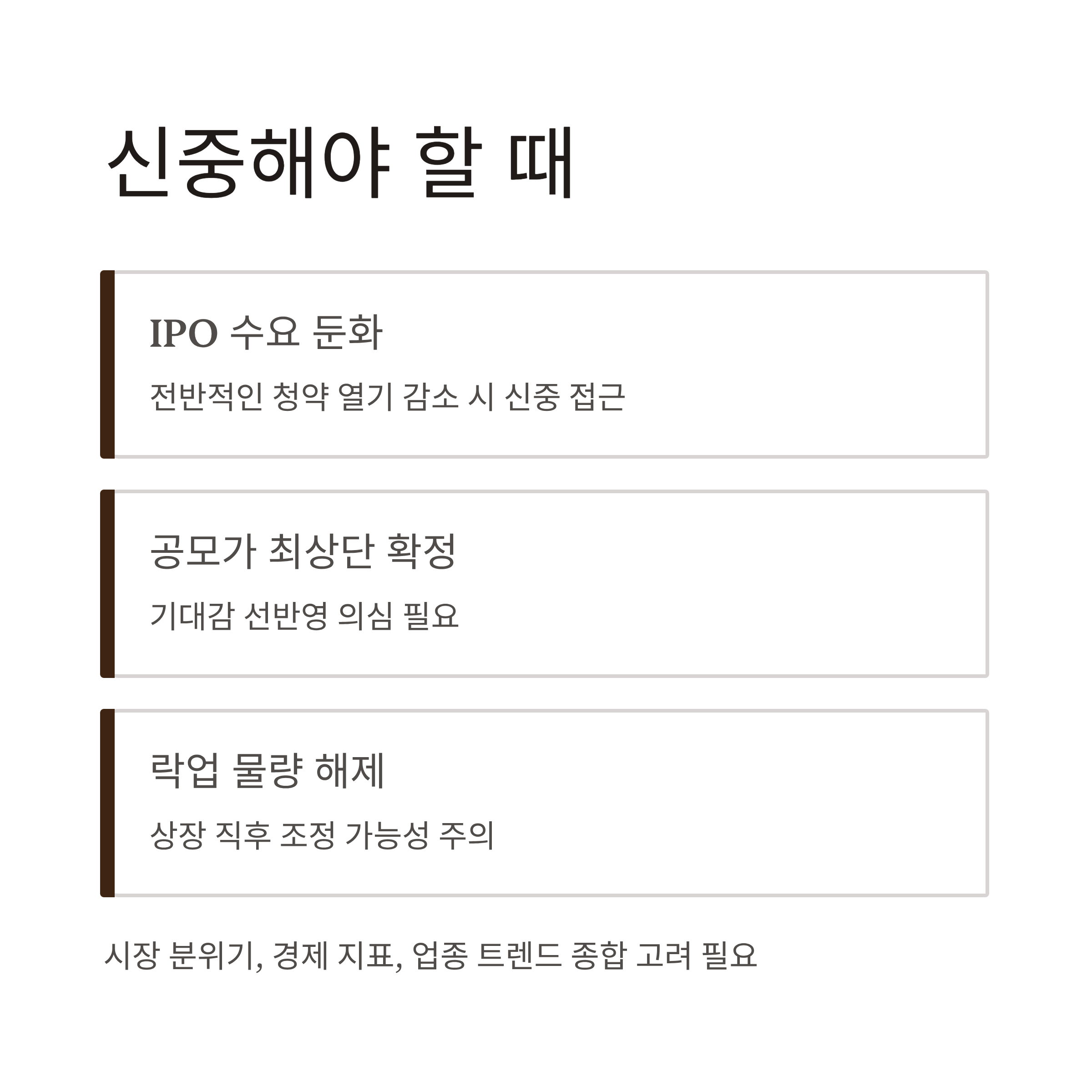 | 주의할 변수 | 락업 해제 일정, 경쟁률 과열 여부, 업종 성장성 등 |