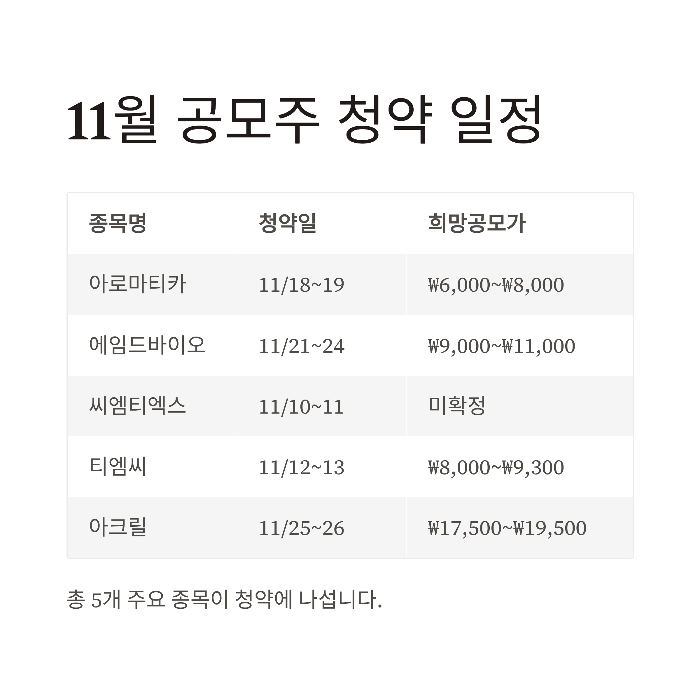 11월은 총 5개의 주요 종목이 청약에 나섭니다. 아직 수요예측이나 경쟁률이 확정되지 않은 경우도 있지만, 기본적인 일정과 희망 공모가 범위만으로도 분위기를 읽을 수 있어요.