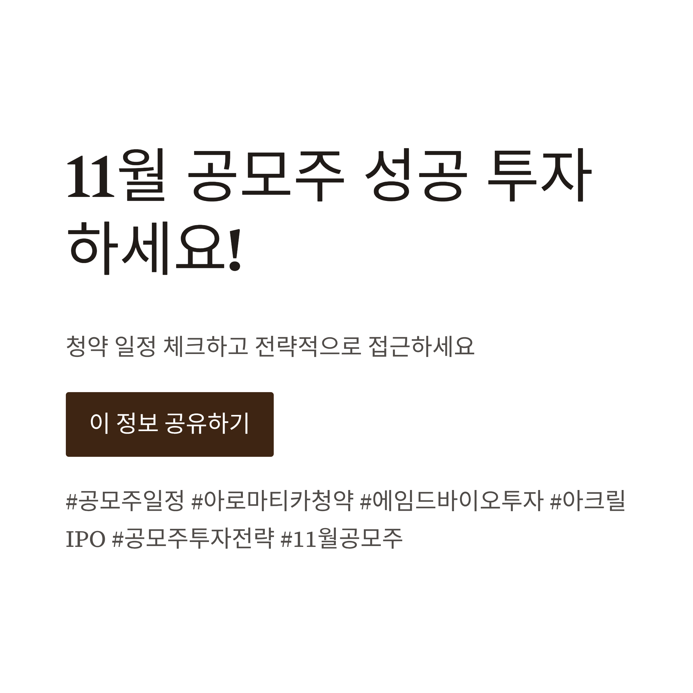 | 아로마티카 | 수요예측 11/3~7 예정 | 약 30.33% (일반 배정 추정) |