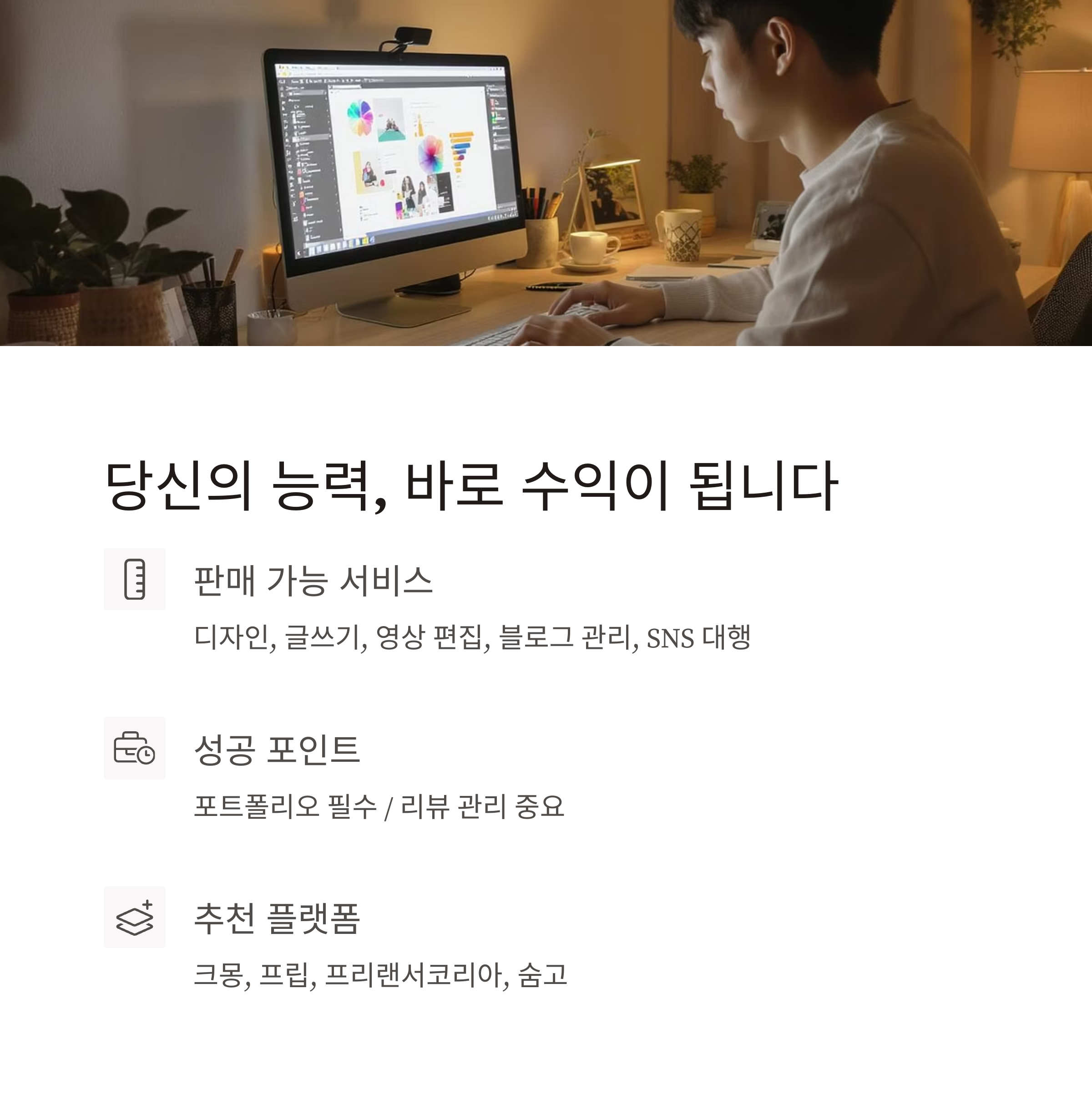 디자인, 글쓰기, 영상 편집, 블로그 관리, SNS 대행 등