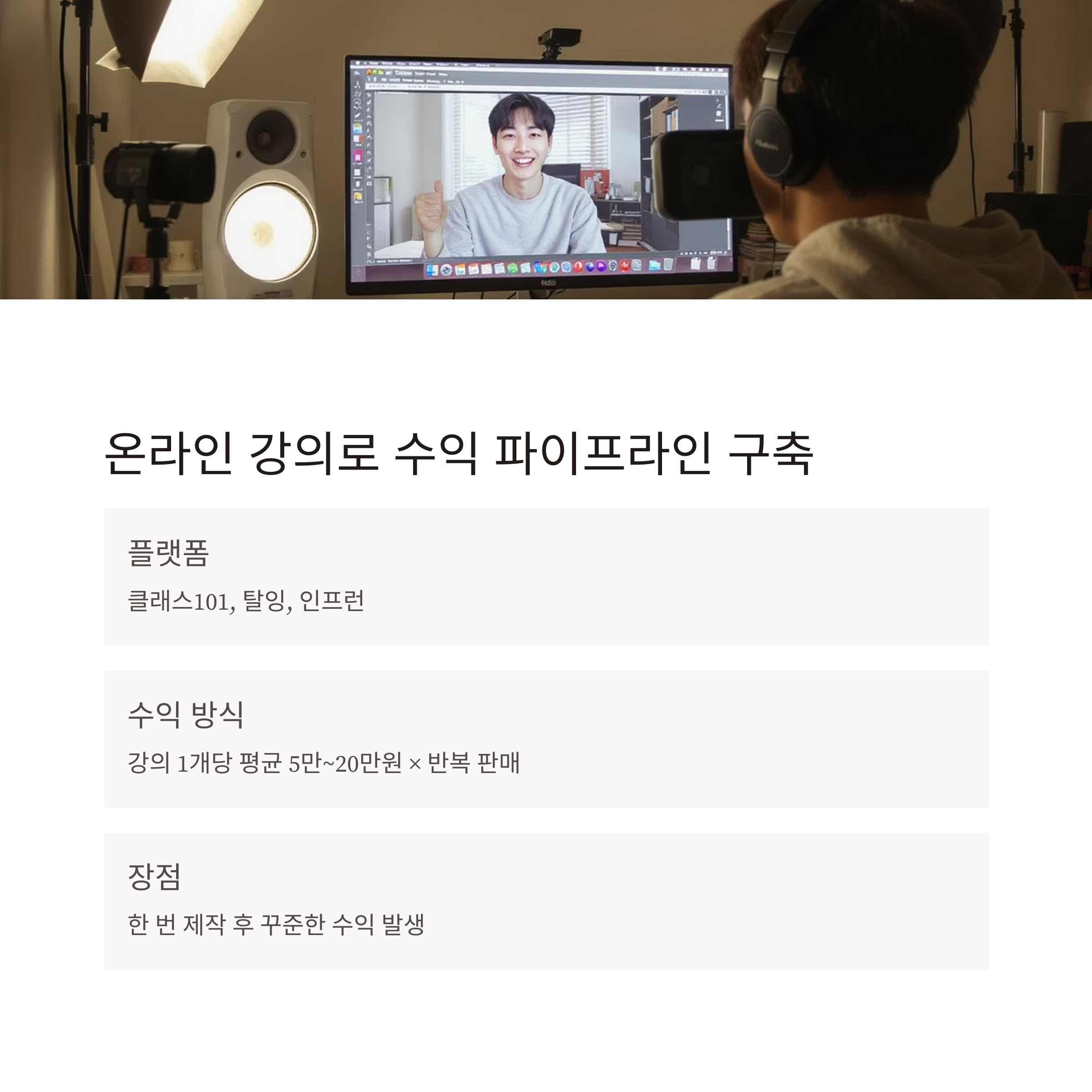| 수익 방식 | 강의 1개당 평균 5만~20만원 × 반복 판매 |