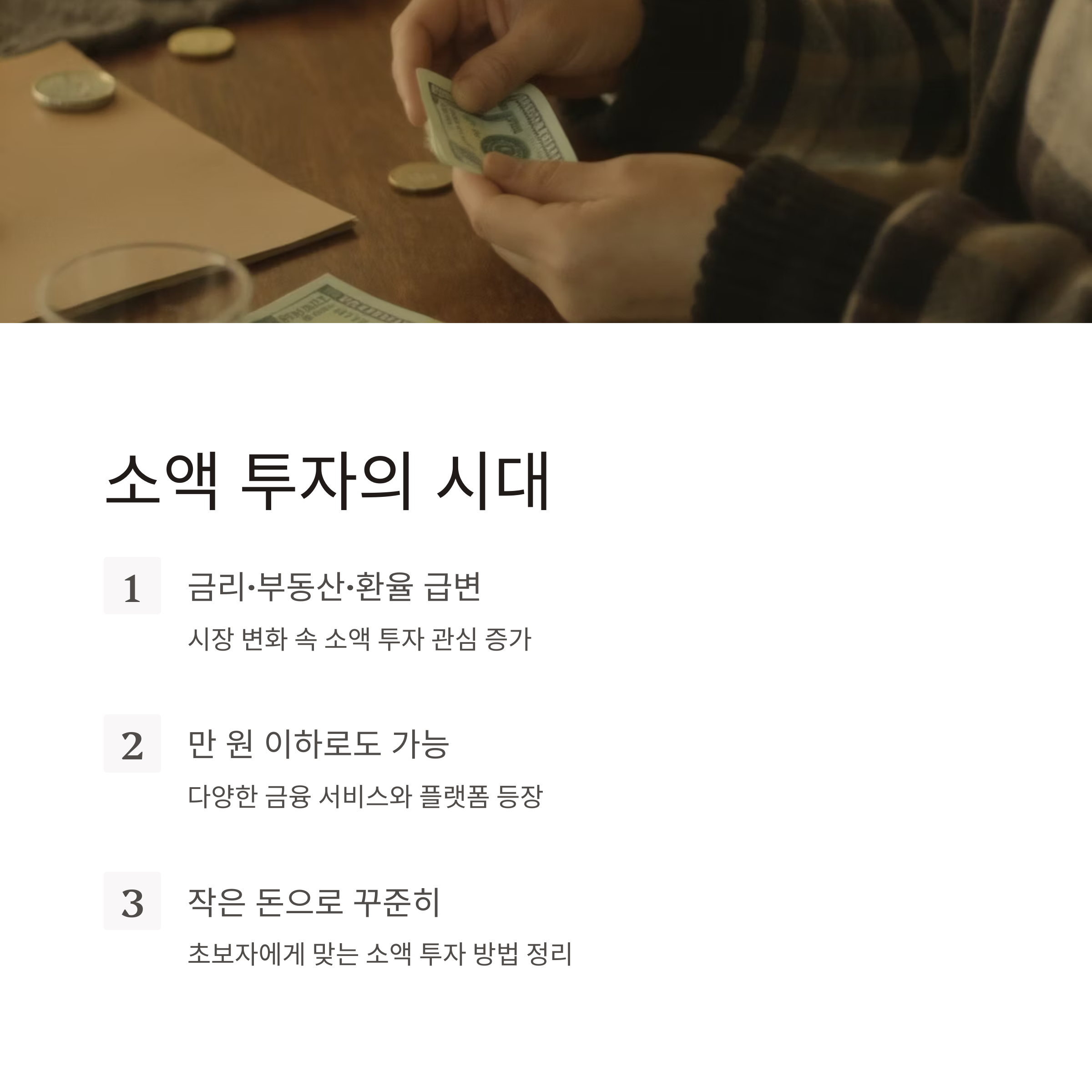 2025년은 금리, 부동산, 환율까지 급변하는 시장 속에서 '소액 투자'에 대한 관심이 그 어느 때보다 높아지고 있습니다.