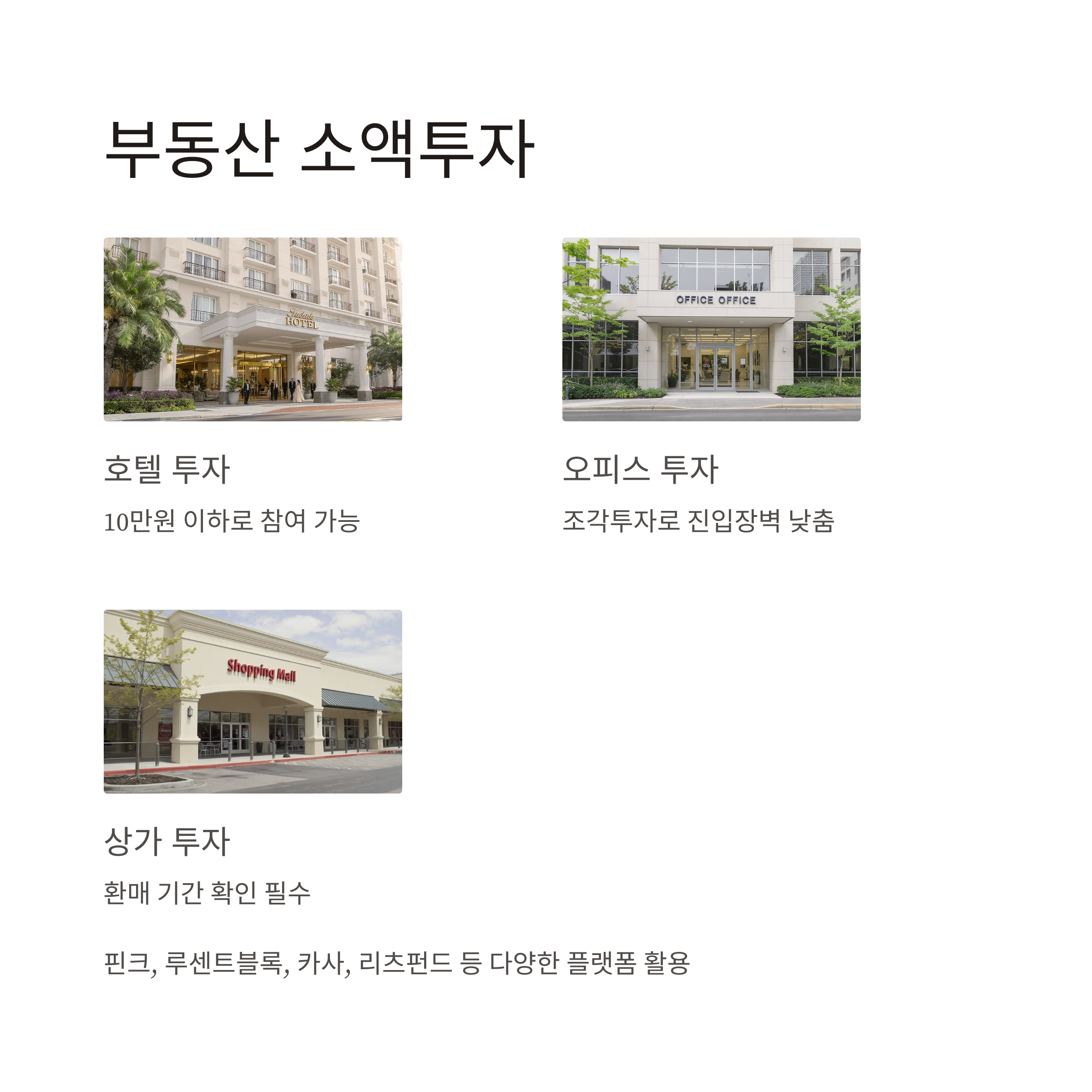 핀크, 루센트블록, 카사, 리츠펀드 등을 통해 호텔, 오피스, 상가 등에도 소액으로 투자할 수 있습니다.