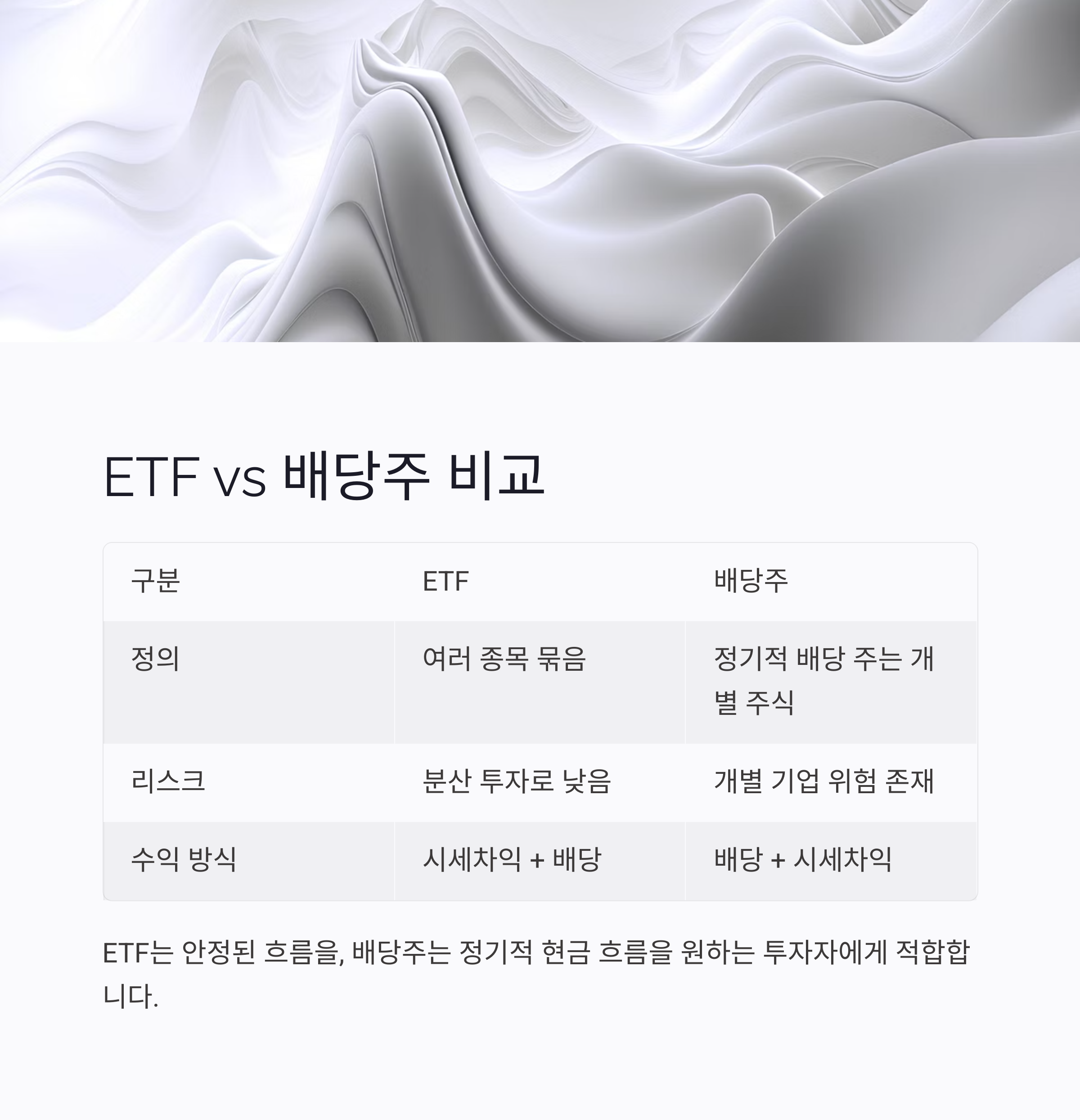 ETF는 안정된 흐름을 배우고 싶은 투자자에게, 배당주는 매월 또는 분기 현금 흐름이 필요한 투자자에게 적합합니다.