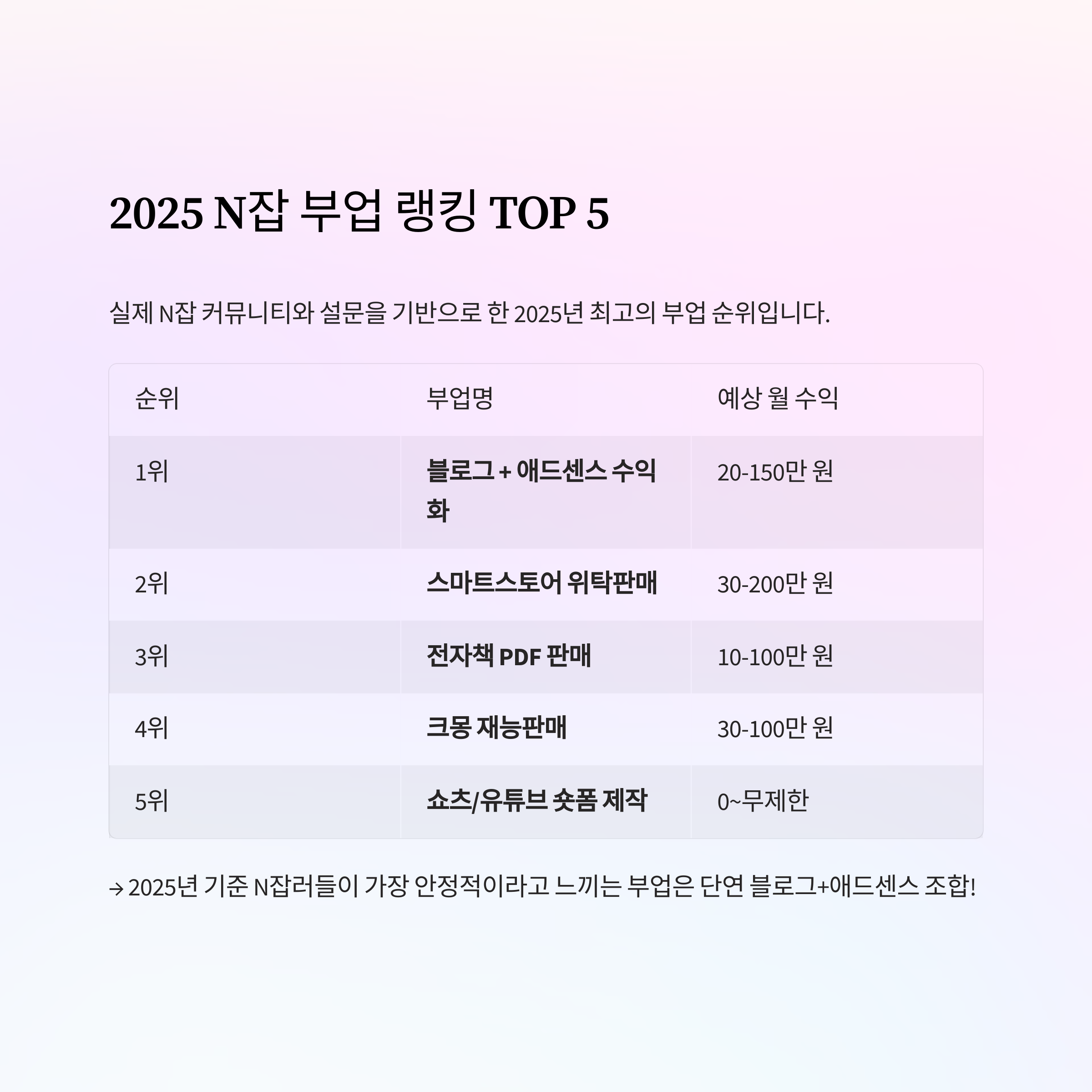 📊 2025 N잡 부업 랭킹 TOP 5 (실제 N잡 커뮤니티·설문 기반)