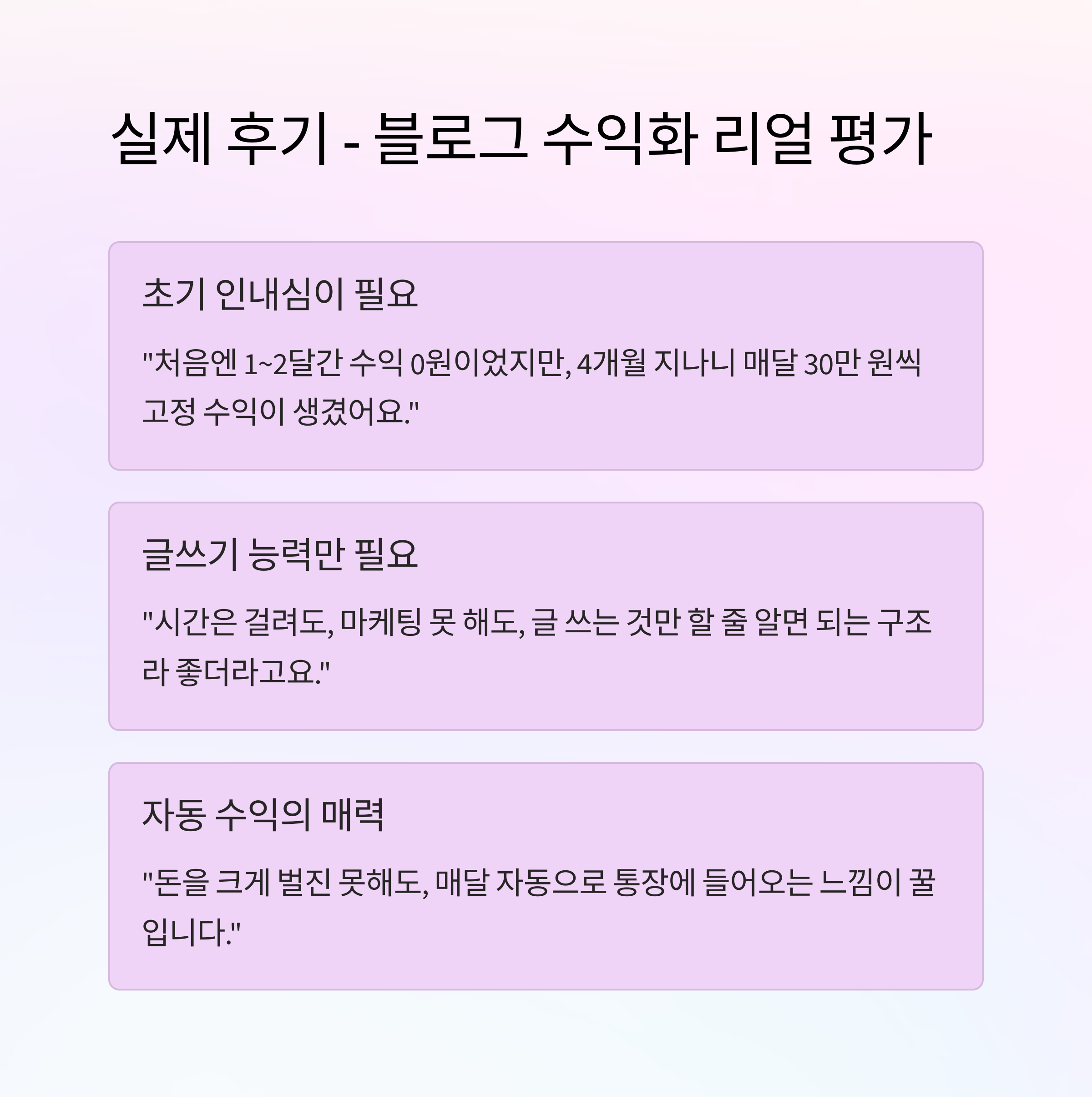 💬 실제 후기 요약 – 블로그 수익화에 대한 리얼 평가