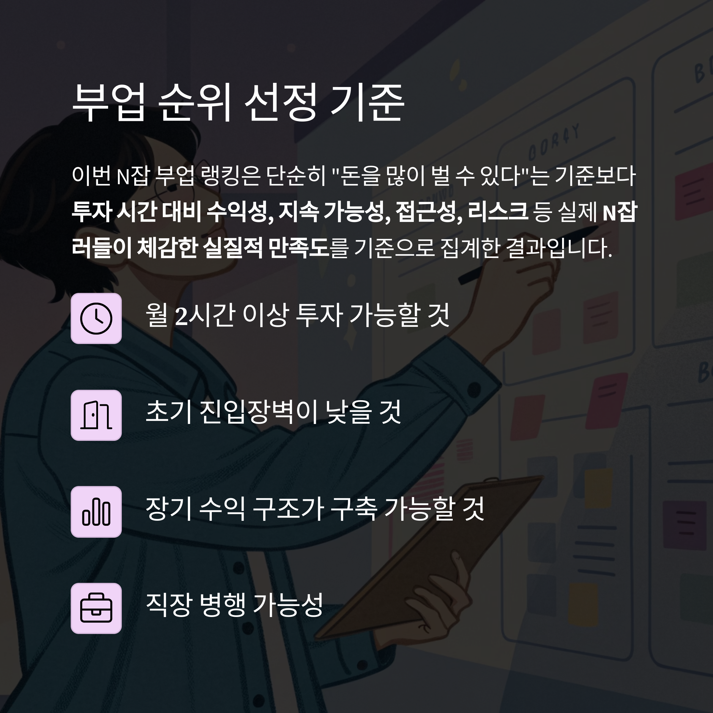 이번 N잡 부업 랭킹은 단순히 “돈을 많이 벌 수 있다”는 기준보다