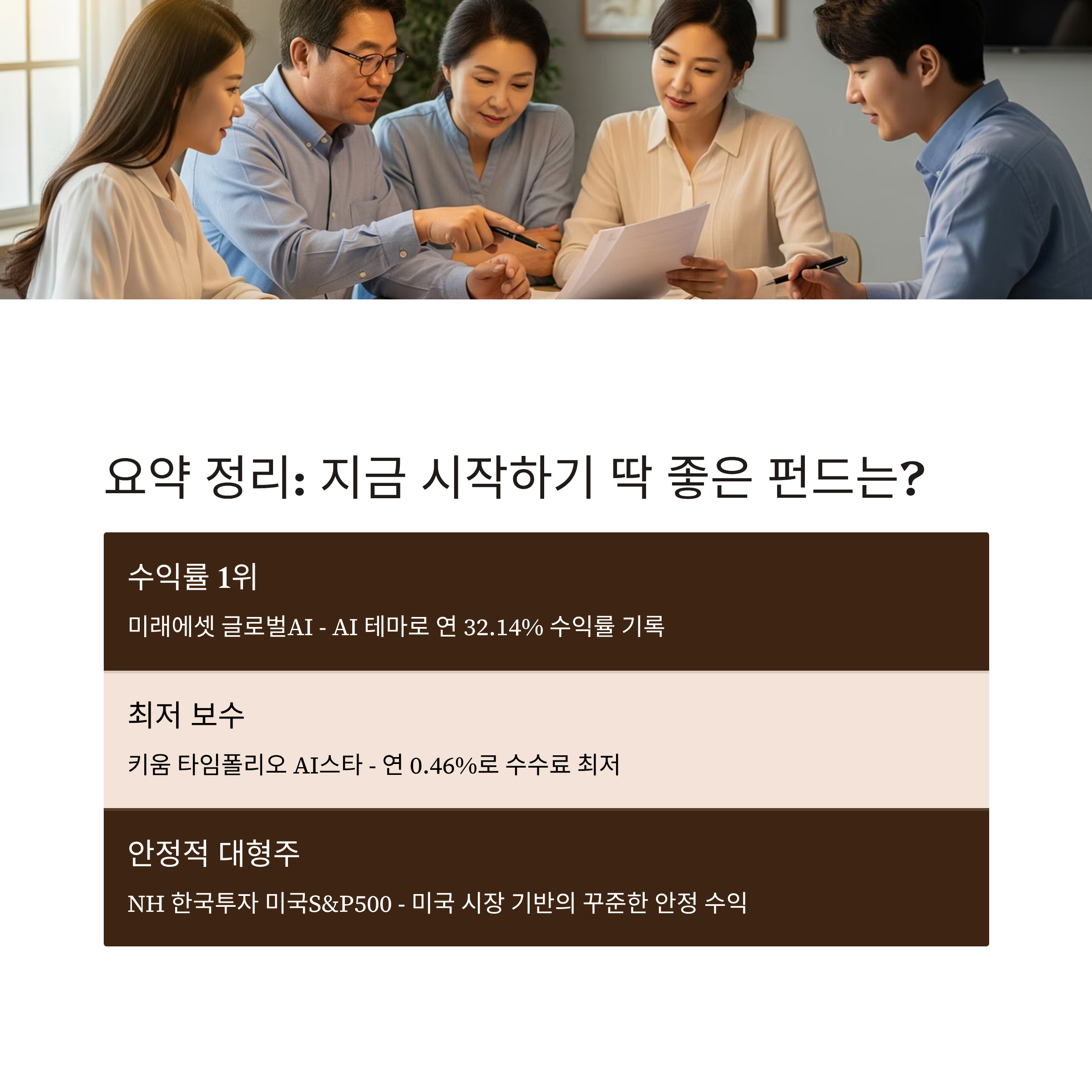 • 수수료 최저: 키움 타임폴리오 AI스타 (연 0.46%, 효율성 최고)