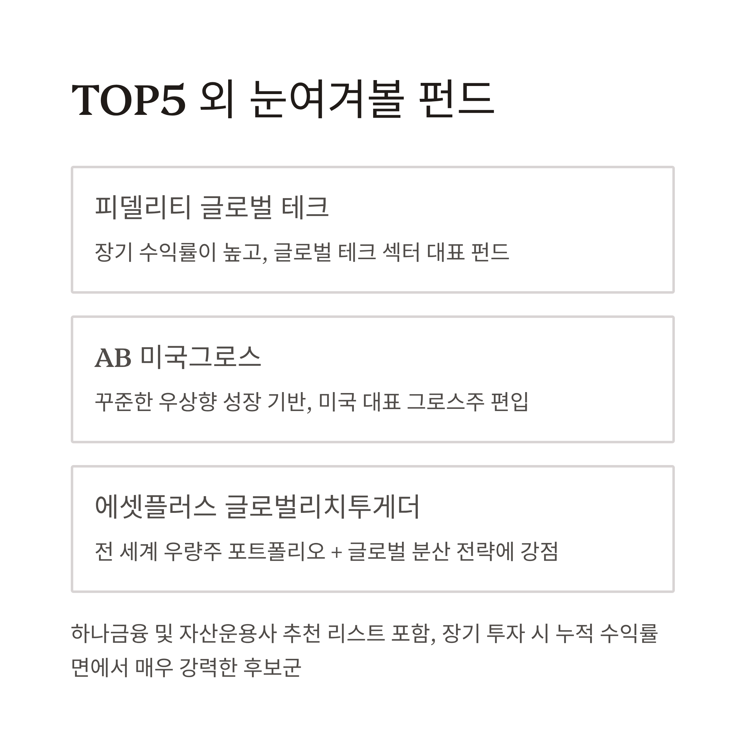 이 펀드들은 하나금융 및 자산운용사 추천 리스트에도 포함되며, 장기 투자 시 누적 수익률 면에서 매우 강력한 후보군입니다.