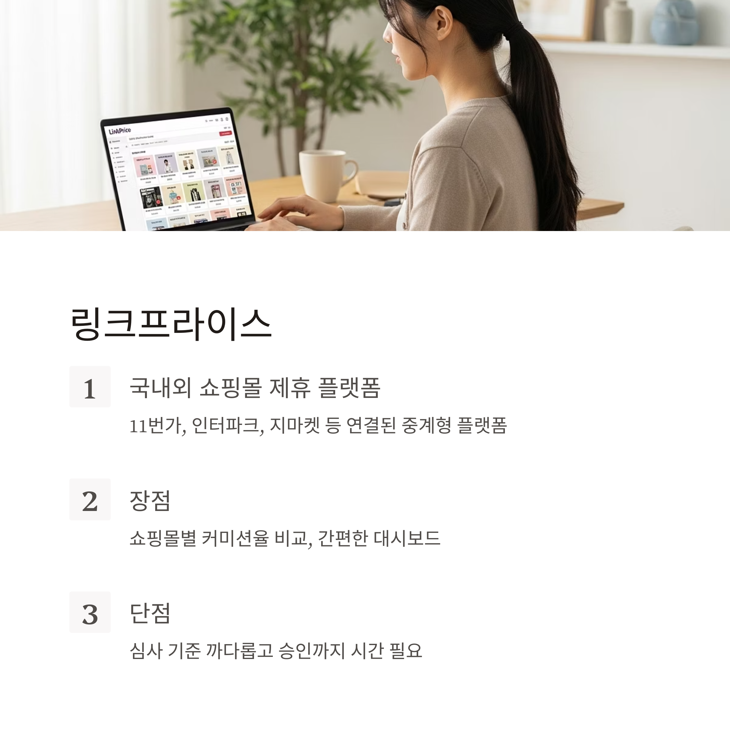 | 링크프라이스 | 국내 | 쇼핑몰별 다름 | 중계형 관리, 대형 쇼핑몰 연동 | 심사 까다로움 |
