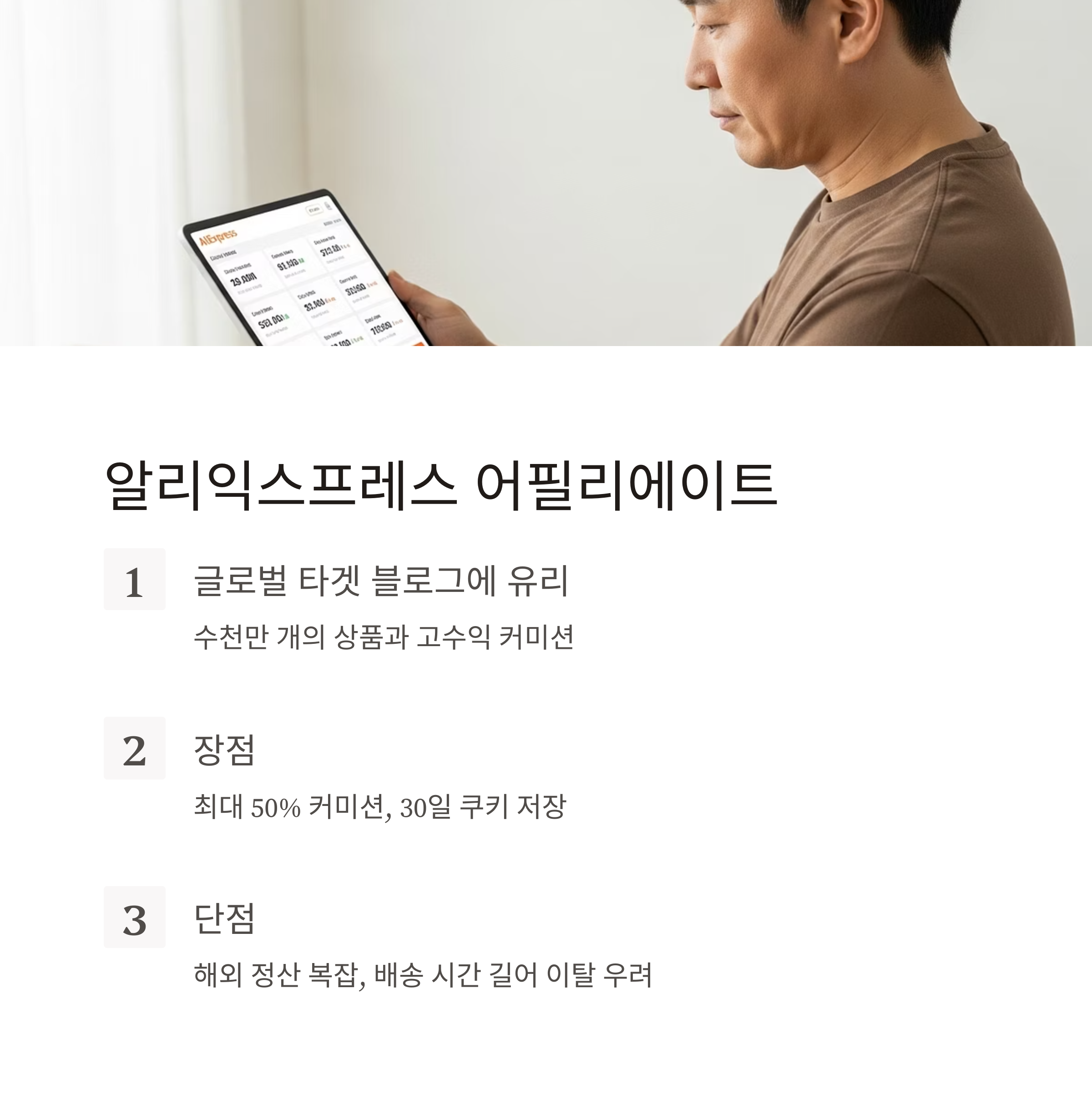 | 알리익스프레스 | 해외 | 3~50% | 고수익, 트렌드 상품 다양 | 정산 복잡, 배송 지연 |