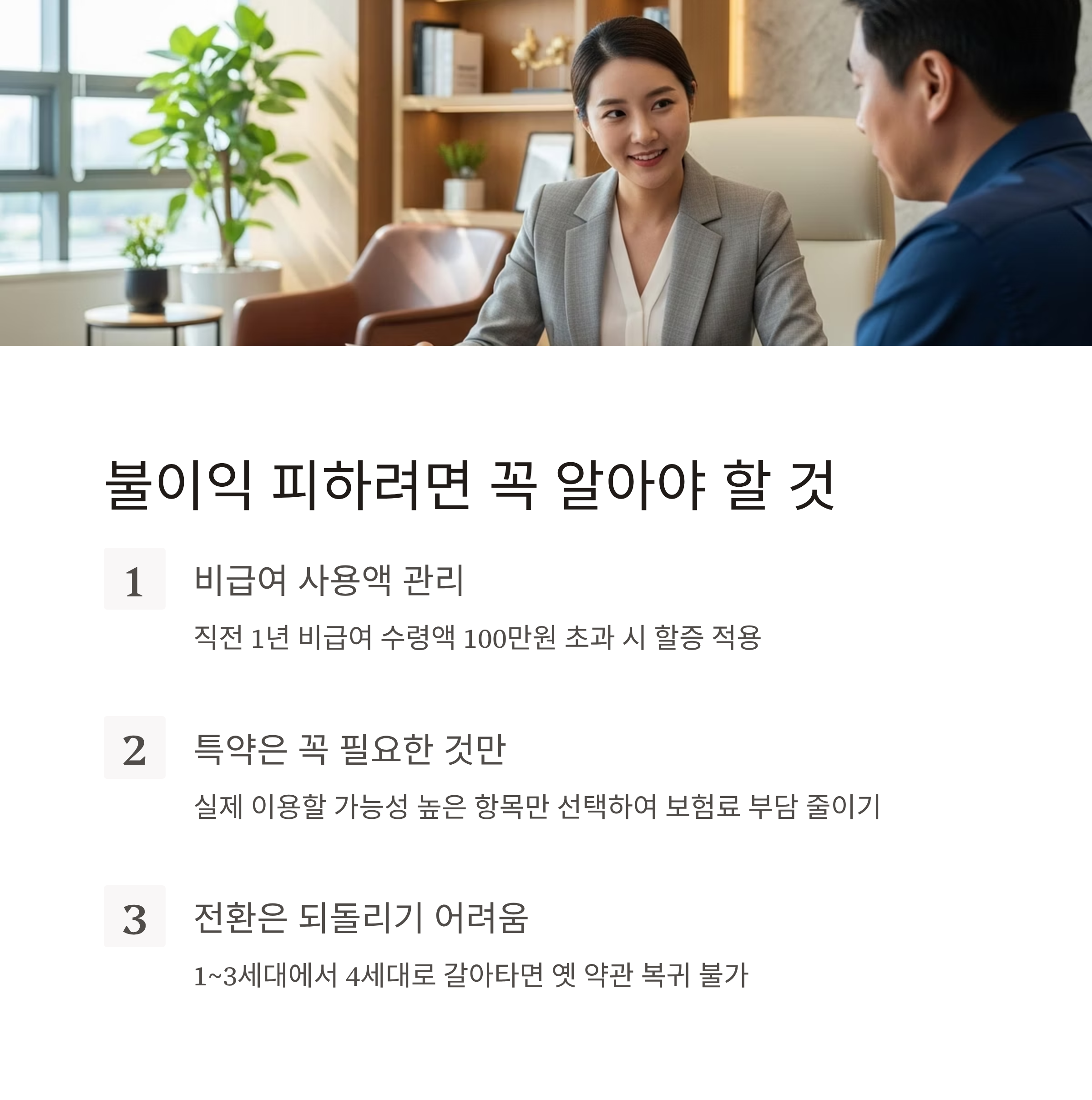 전환 여부를 판단할 땐, 지난 1년간 진료 기록(급여·비급여 구분)을 기준으로 보험료와 할증 가능성을 계산해보는 것이 가장 확실합니다.