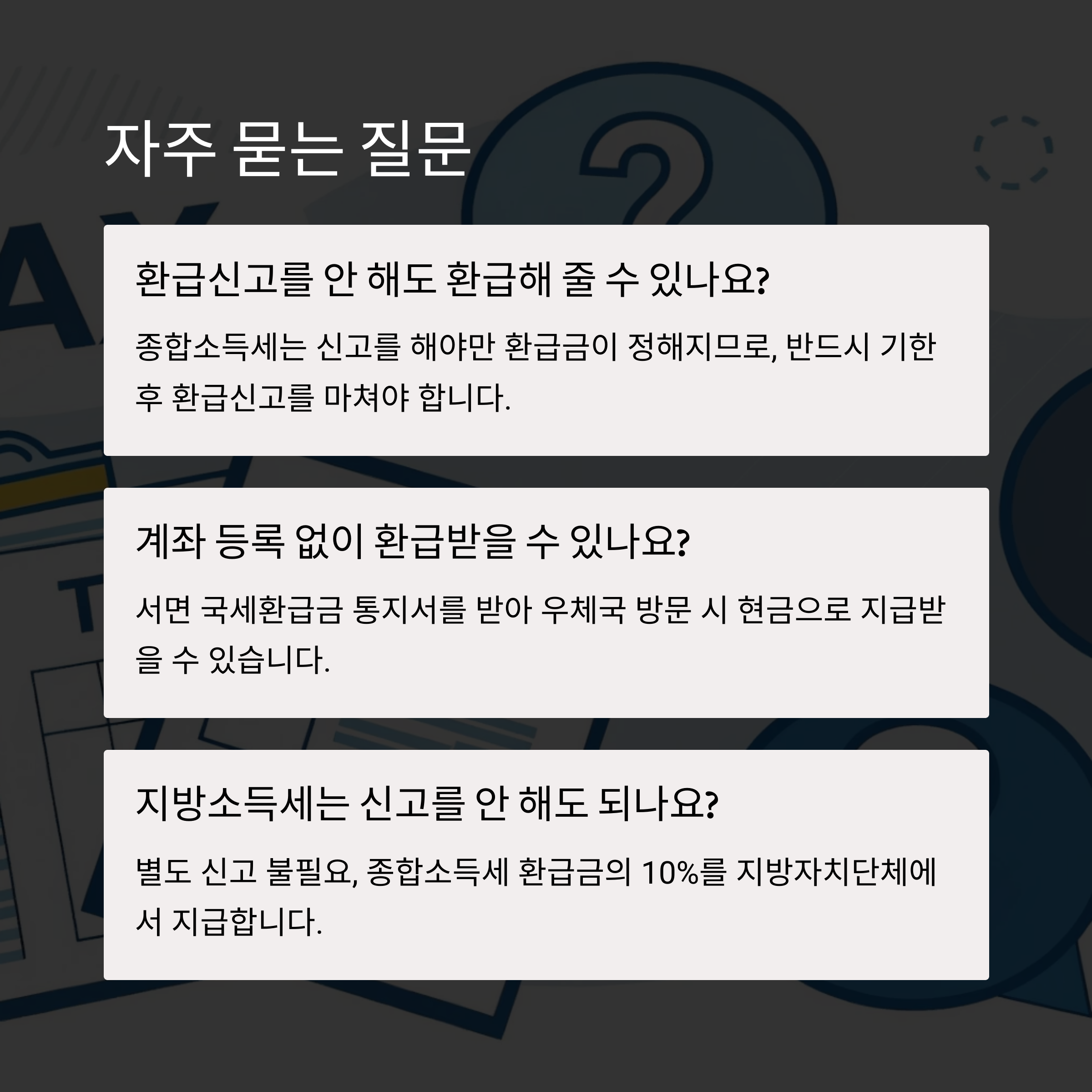 - A: 지방소득세는 별도로 신고할 필요 없으며, 종합소득세 환급금의 10%를 지방자치단체에서 지급합니다.
