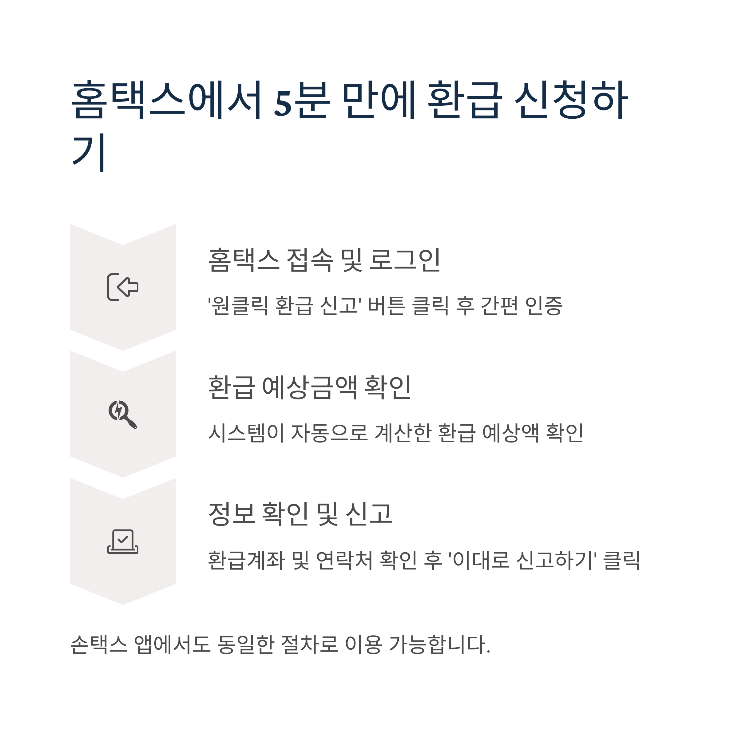 홈택스 또는 손택스 앱에서 5분 만에 환급 신청이 가능합니다.