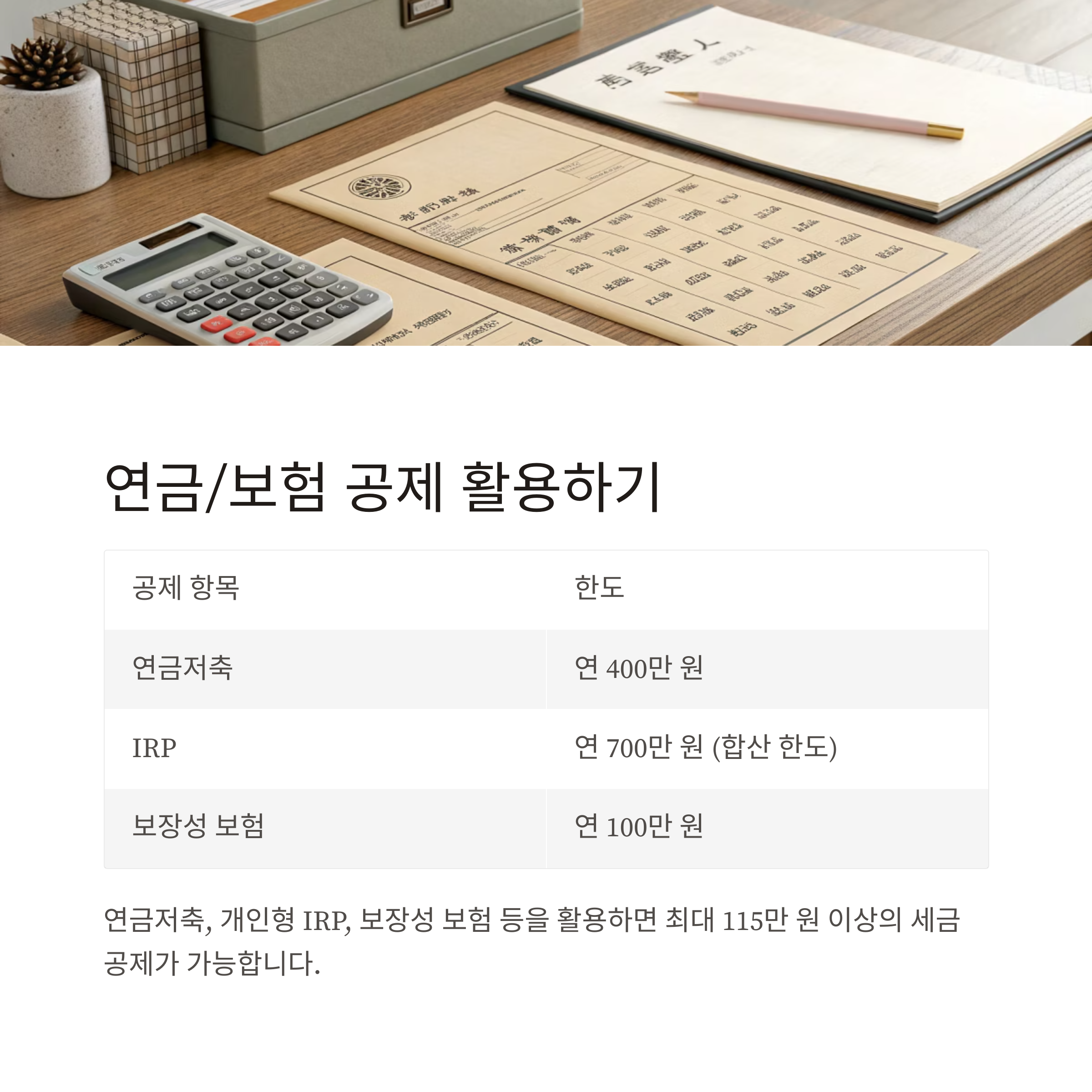 국세청은 연금저축, 개인형 IRP, 보장성 보험 등을 활용한 공제를 허용하고 있습니다.