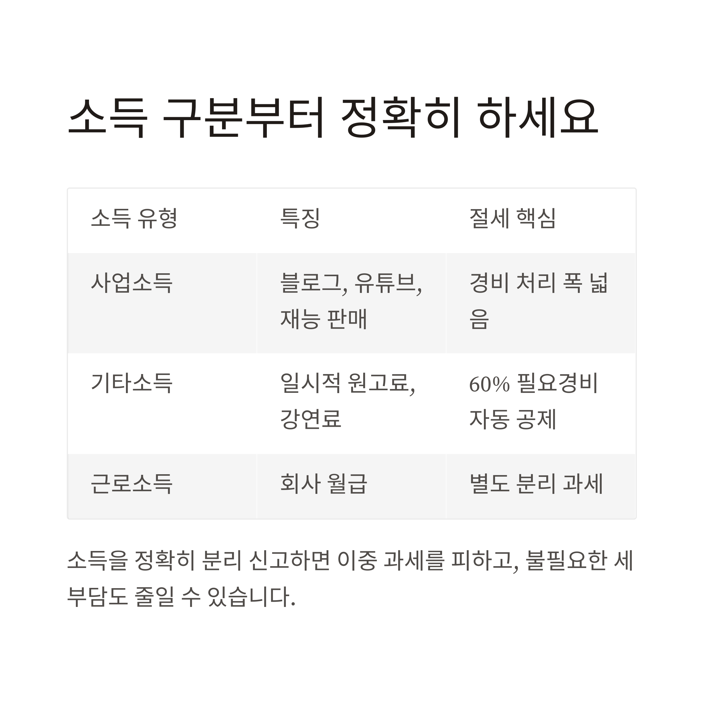 | 사업소득 | 블로그, 유튜브, 재능 판매 | 경비 처리 폭 넓음 |