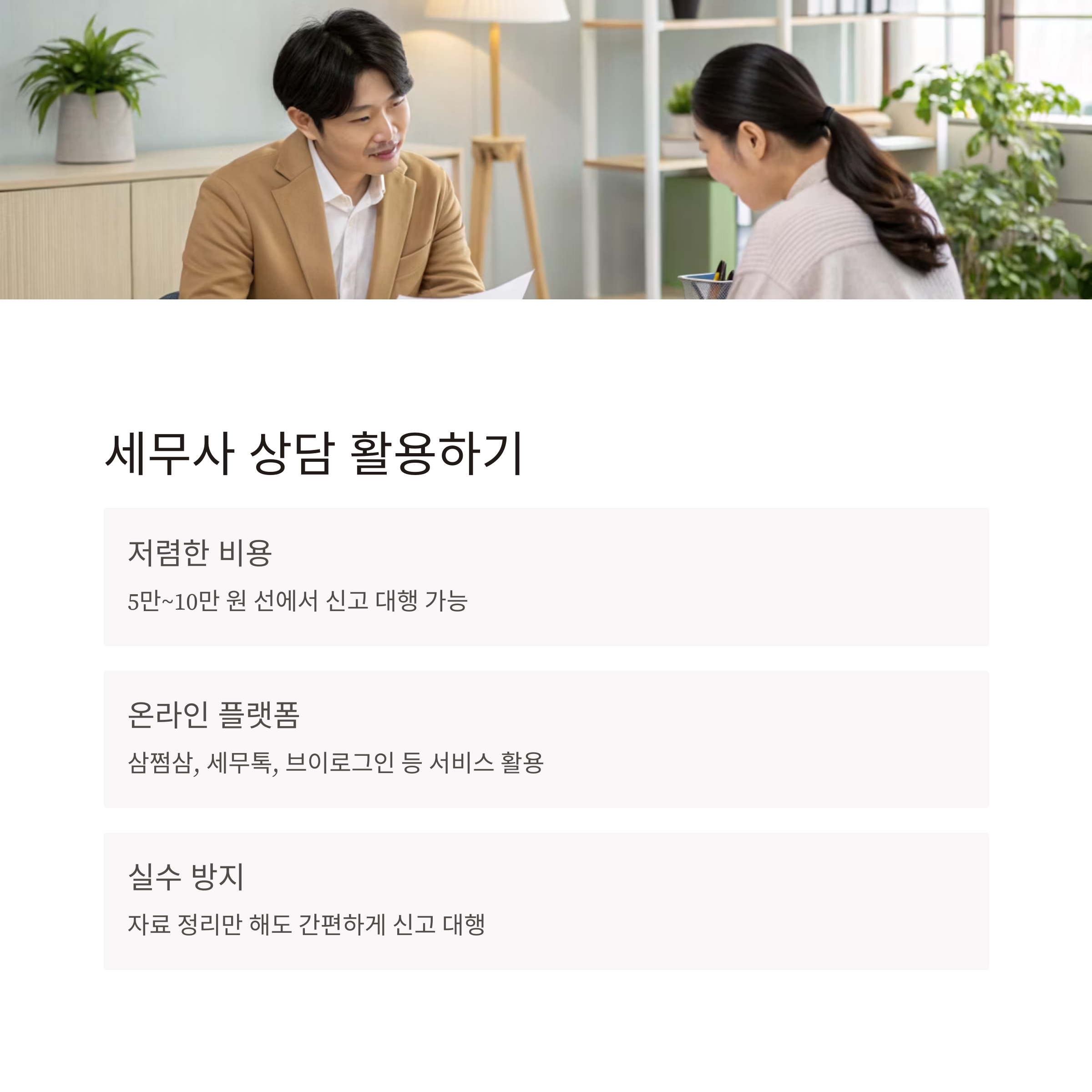 자료 정리만 해도 간편하게 신고를 맡길 수 있어 실수 없는 절세가 가능합니다.