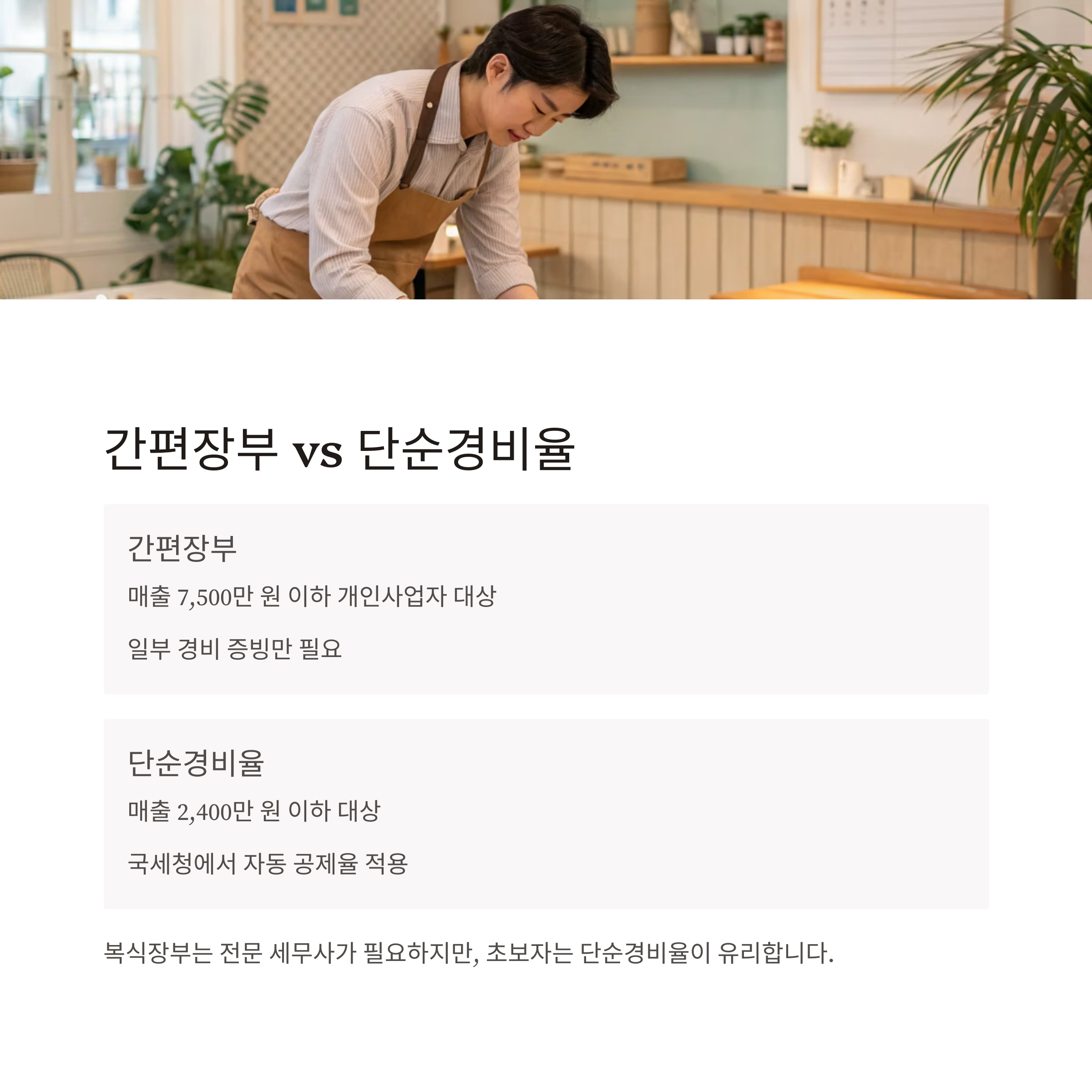 | 간편장부 | 매출 7,500만 원 이하 | 일부 경비 증빙만 필요 |