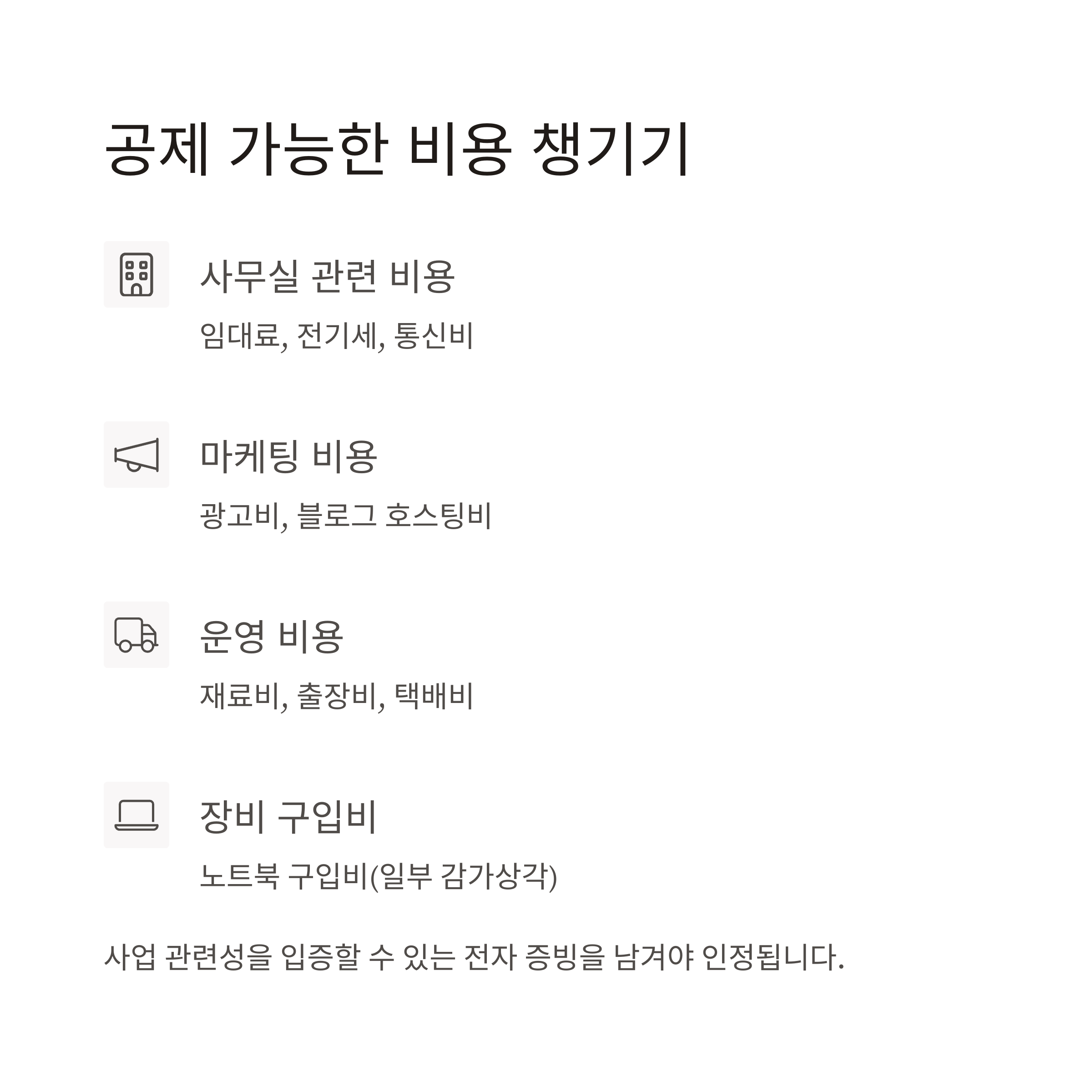 사업 관련 지출은 증빙만 갖추면 경비로 인정되어 과세표준을 줄일 수 있습니다.
