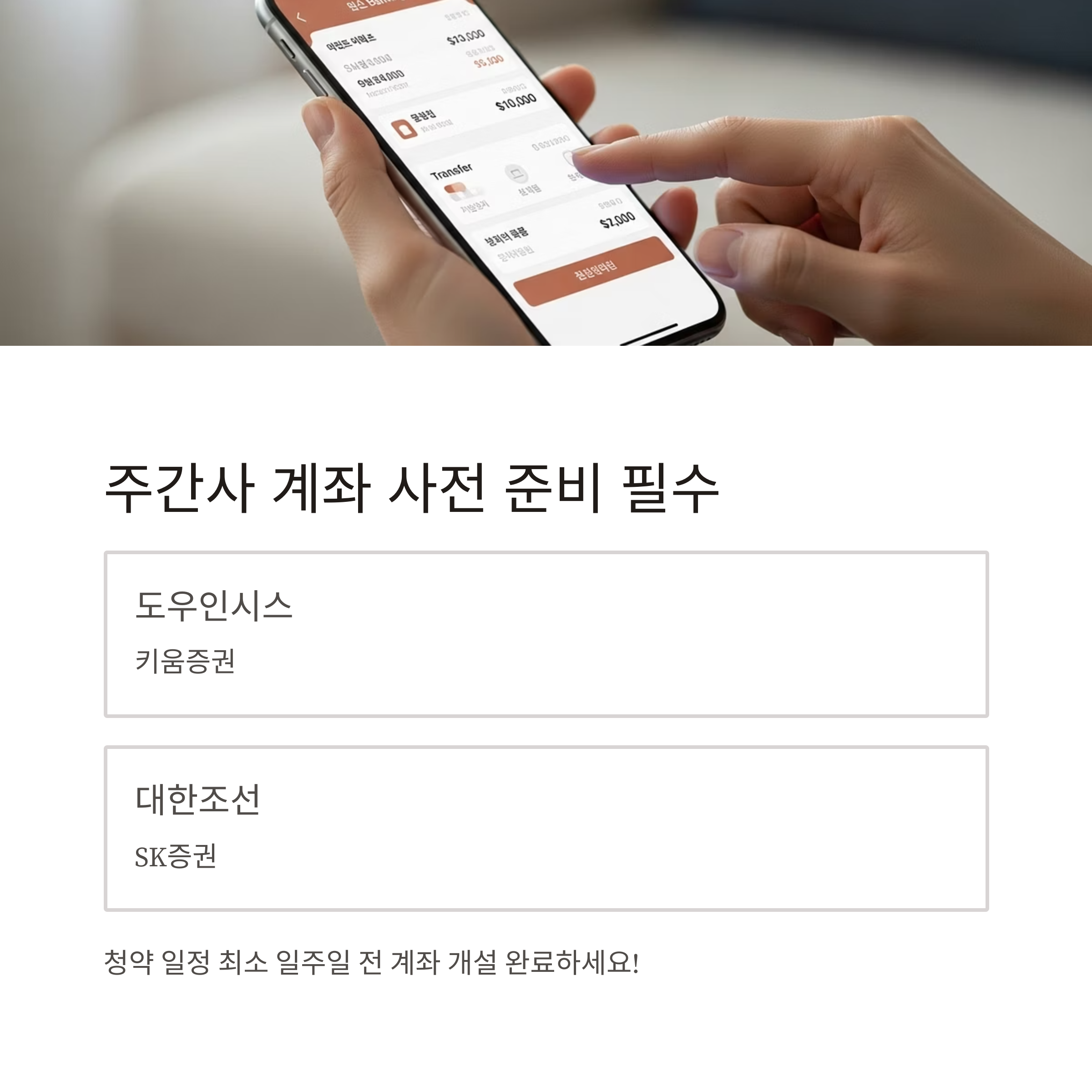 청약 일정에 앞서 최소 일주일 전에는 계좌 개설을 완료해야 합니다.