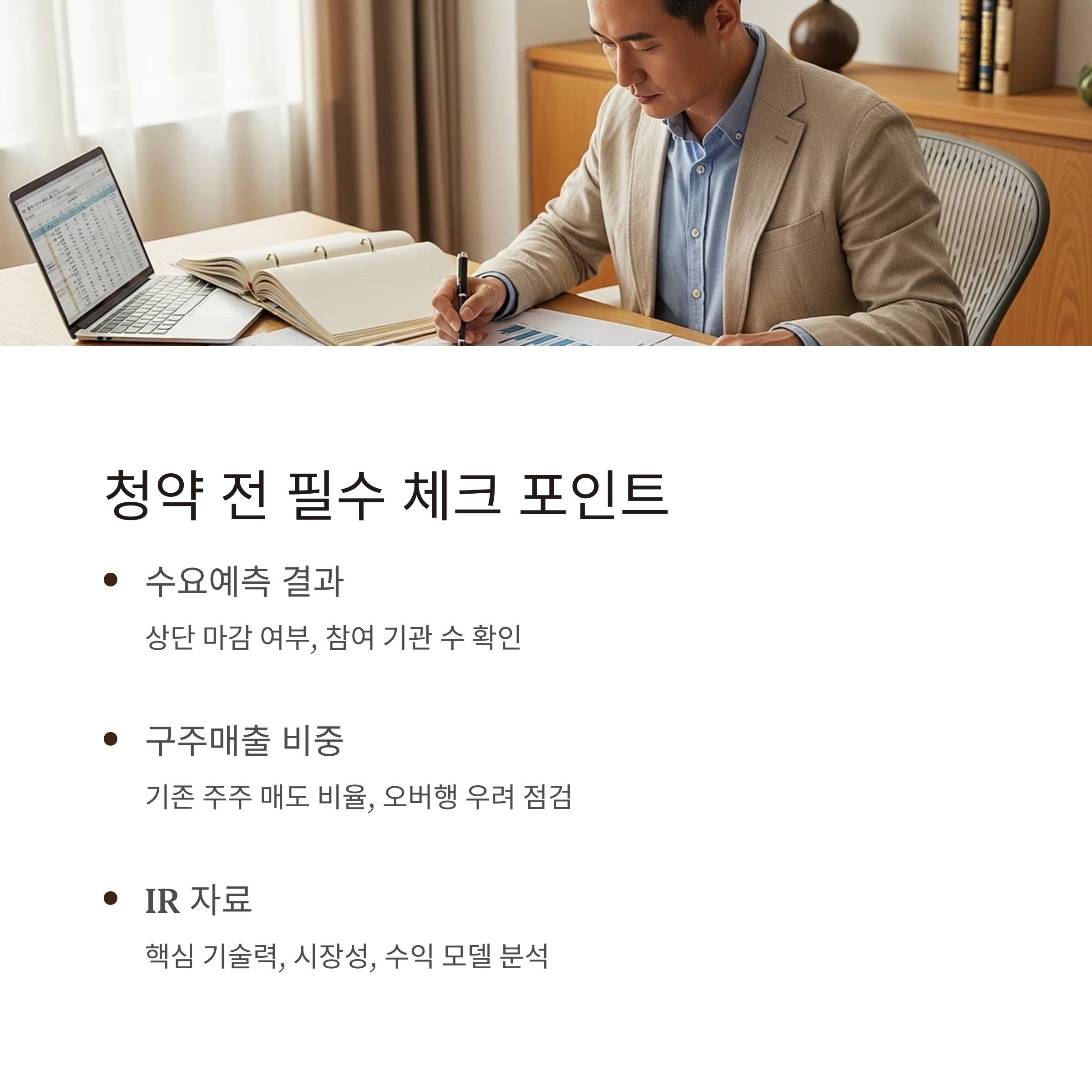 청약 → 수요예측 분석 → IR자료 점검 → 상장일 전략 순으로