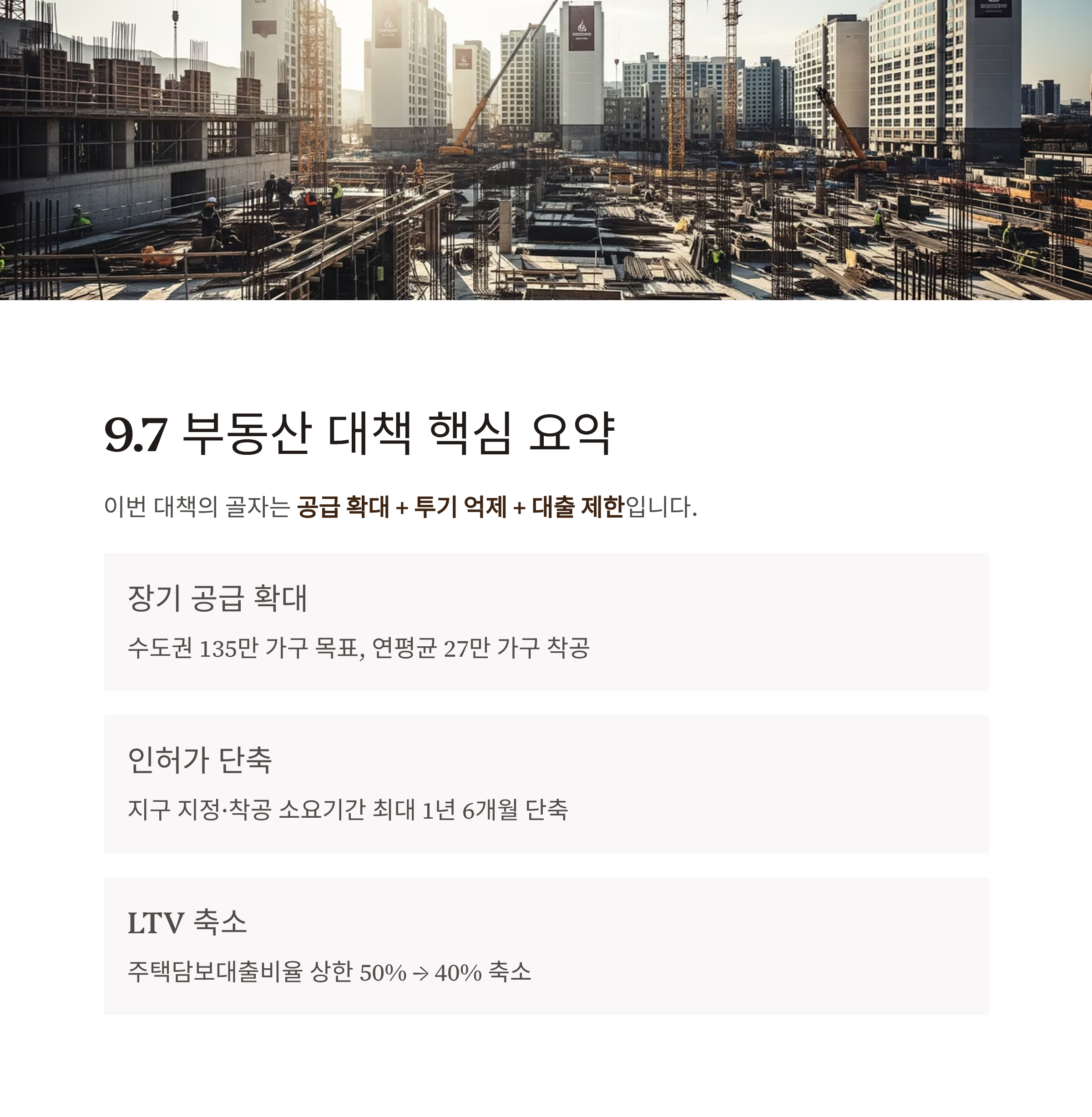 | 장기 공급 확대 | 수도권 135만 가구 목표, 연평균 27만 가구 착공 |
