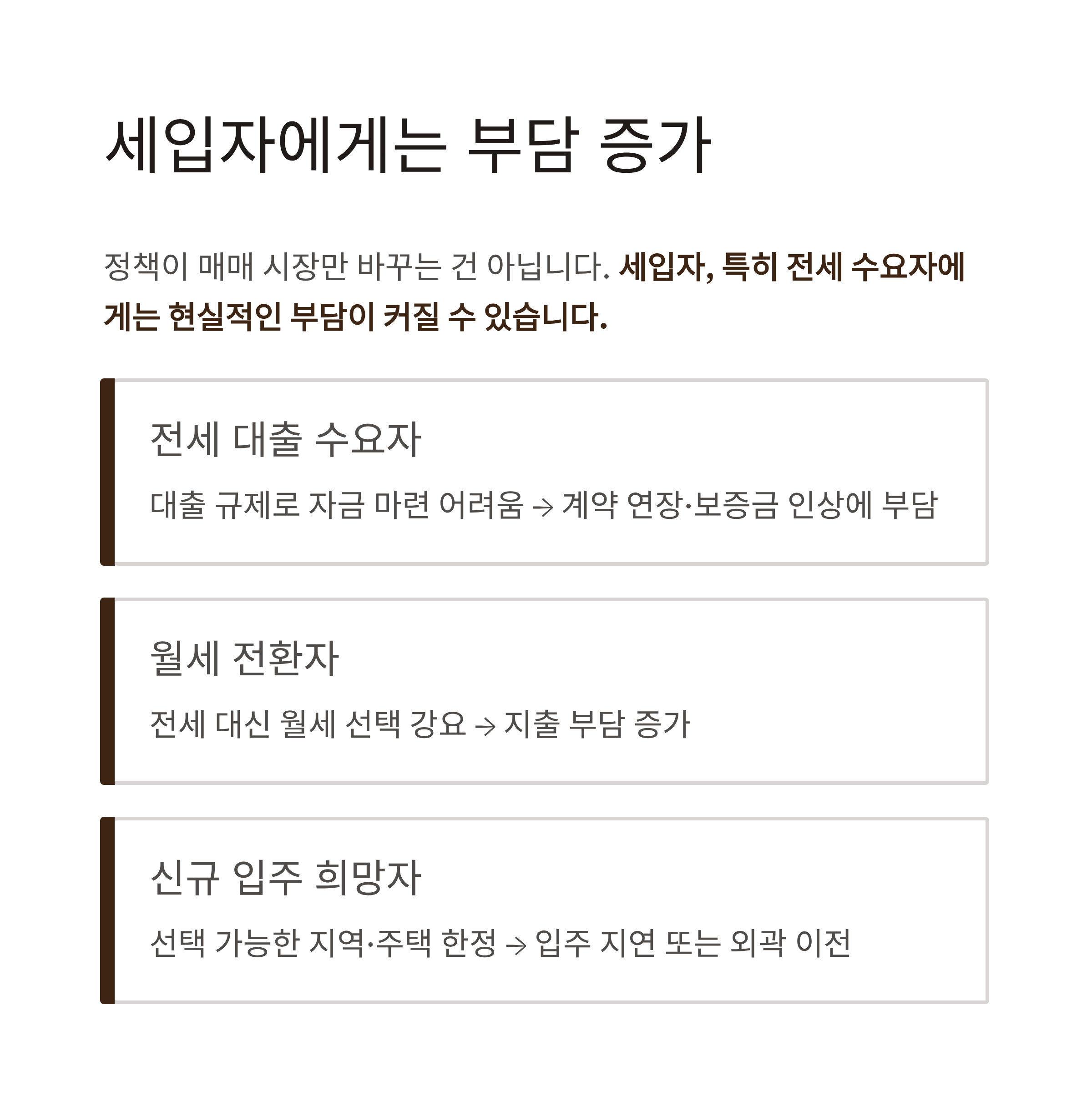 | 세입자 환경 | 대출 규제 + 공급 부족 → 전세 불안정성 증가, 월세 전환 압박 커짐 |