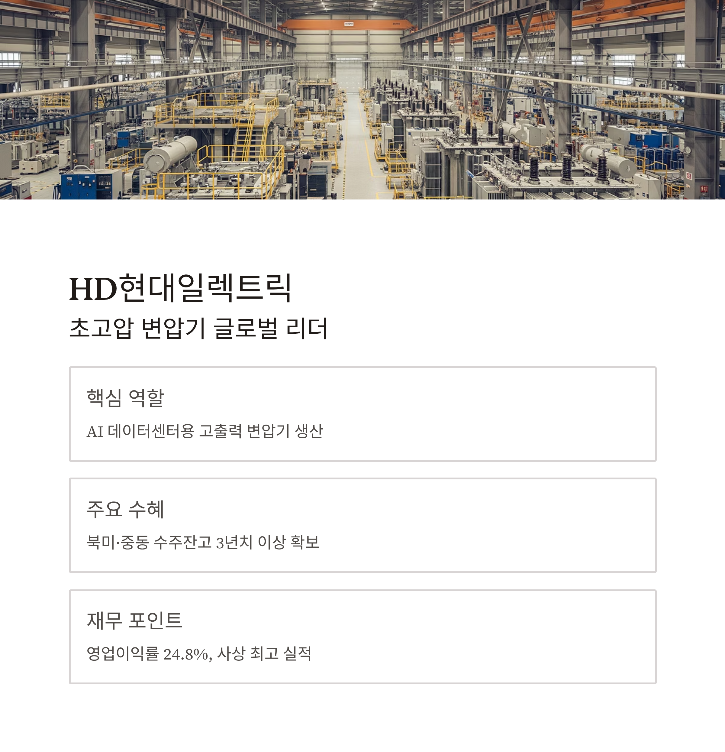 - 주요 수혜: 북미·중동 등에서 초고압 변압기 수요 폭증, 수주잔고 3년치 이상 확보