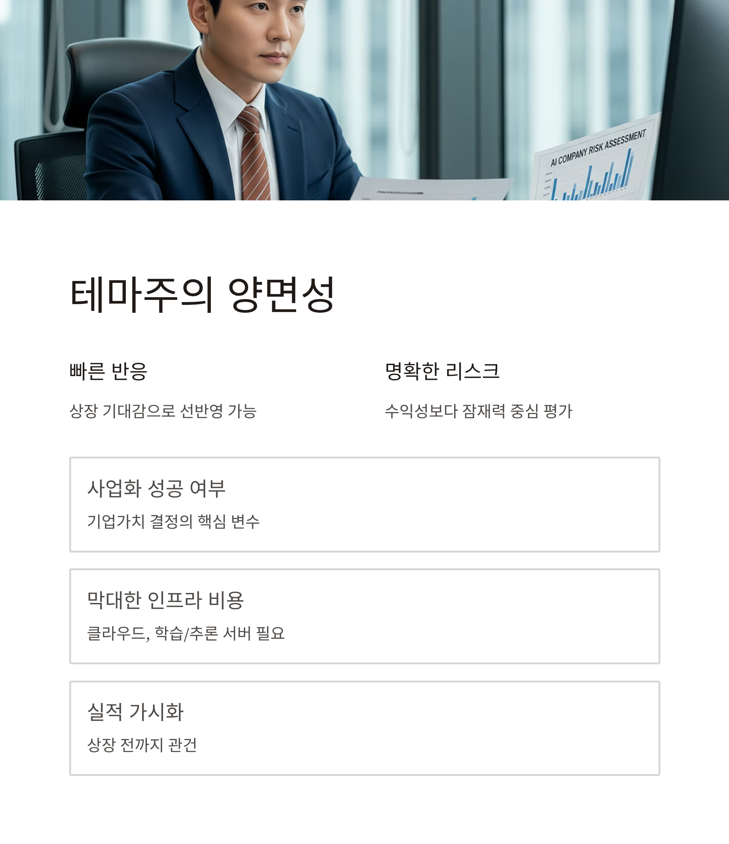 AI 경쟁이 격화되는 가운데, 사업화 성공 여부가 기업가치를 결정지을 중요한 변수입니다. 특히 생성형 AI는 대규모 인프라, 클라우드 비용, 학습/추론 서버 등 막대한 비용이 필요한 분야이기 때문에 상장 전까지 실적 가시화 여부가 관건이 될 것으로 보입니다.