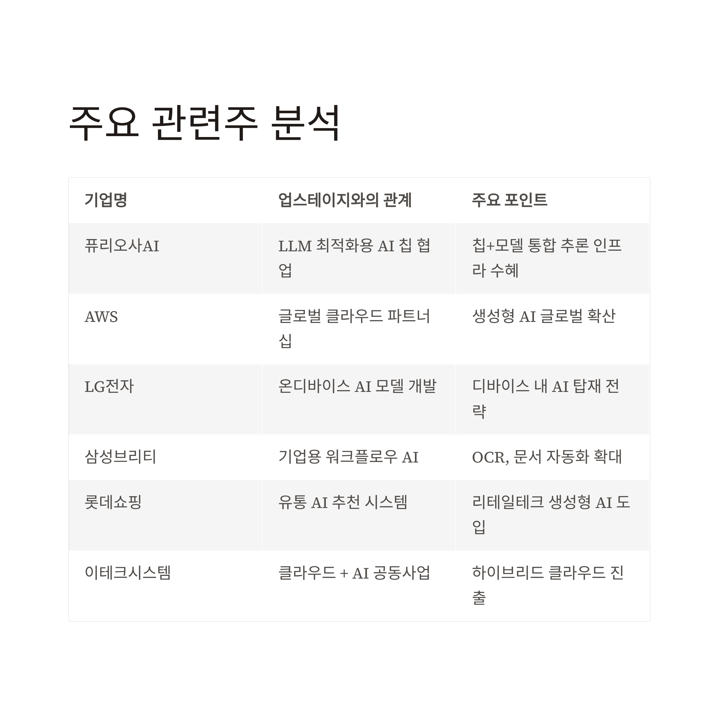 | 퓨리오사AI | LLM 최적화용 AI 칩 협업 | 칩+모델 통합 → 추론 인프라 수혜 가능성 |