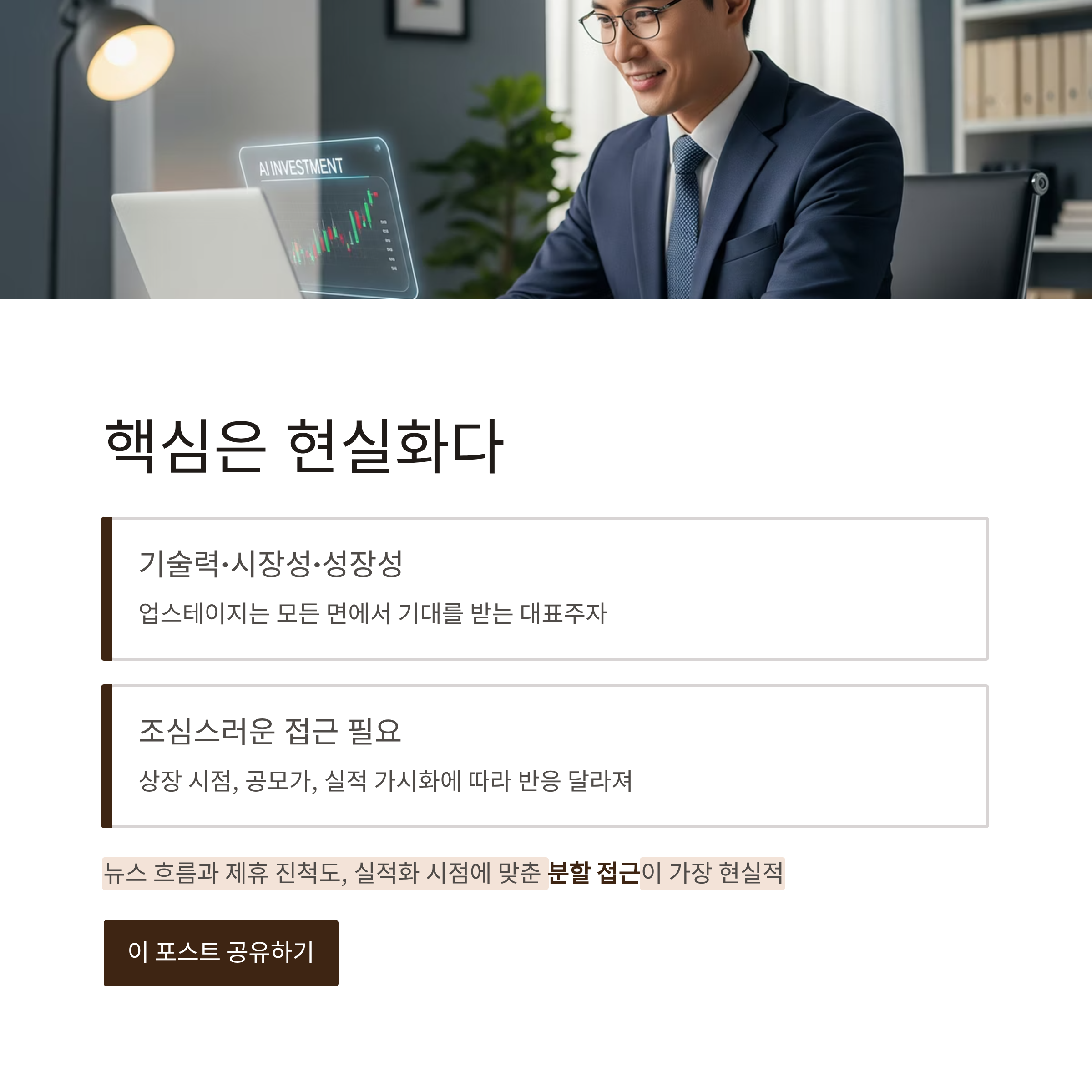 실제 상장 시점, 공모가, 유통물량, 실적 가시화 정도에 따라 시장의 반응은 크게 달라질 수 있습니다. 따라서 지금은 지나친 몰빵보다는 뉴스 흐름과 제휴 진척도, 실적화 시점에 맞춘 분할 접근이 가장 현실적인 전략입니다.