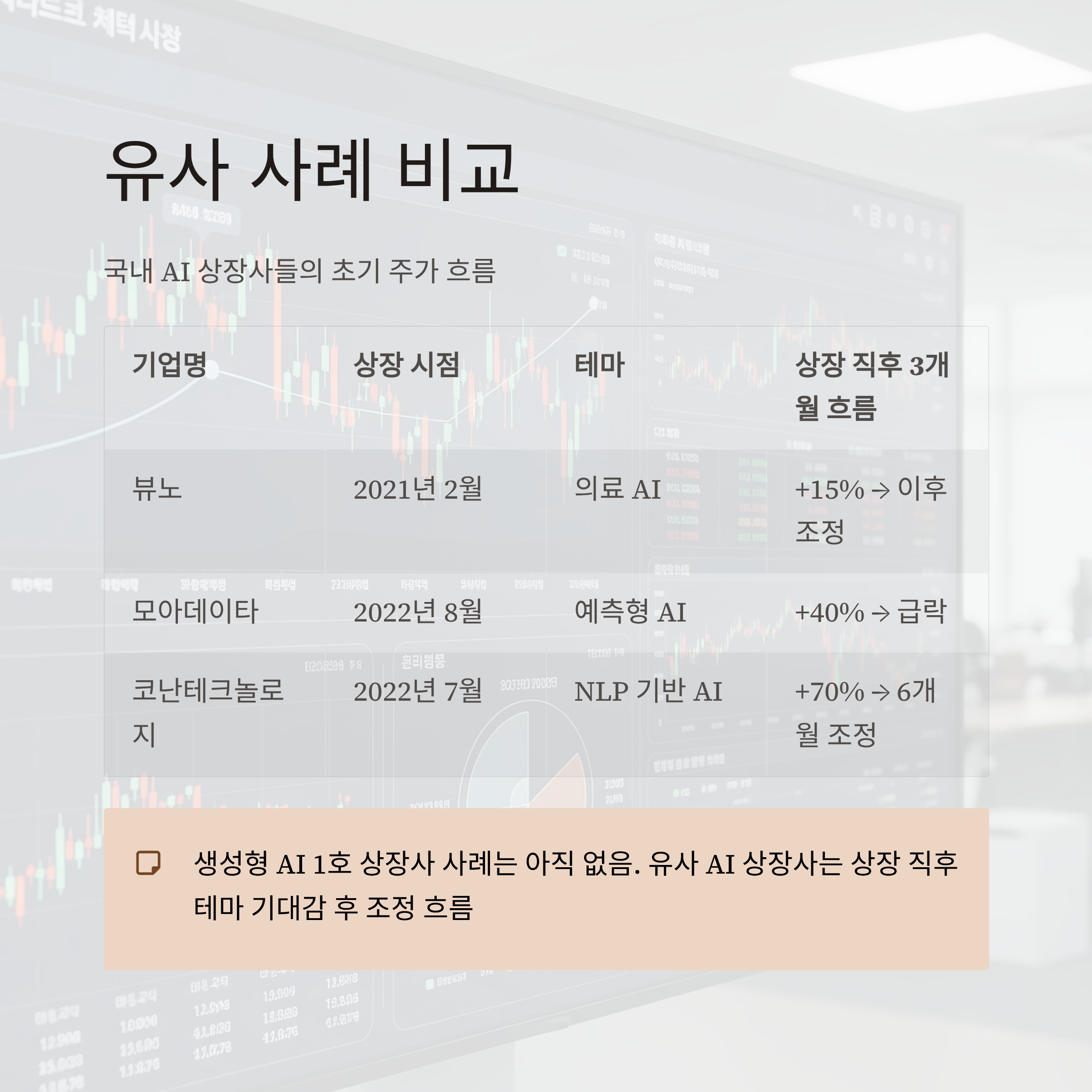 ※ 생성형 AI 1호 상장사 사례는 아직 없지만, 유사 AI 상장사의 흐름은 상장 직후 테마 기대감 후 조정 흐름이 많았습니다.