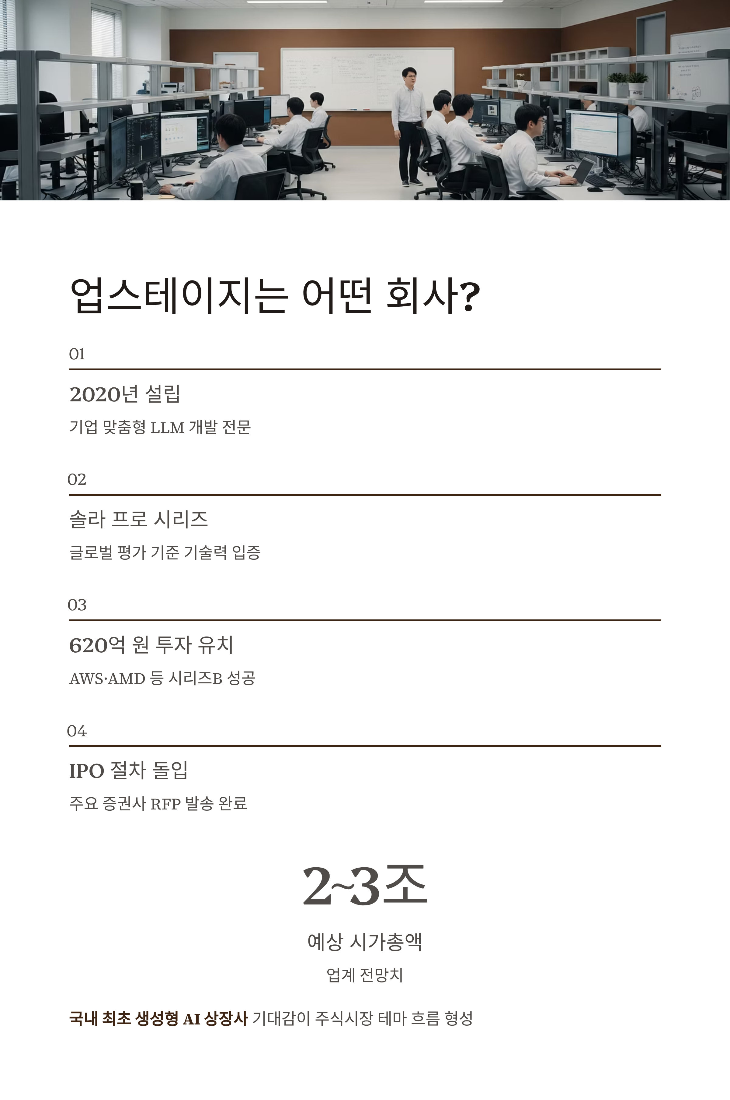 2025년 중순, 업스테이지는 AWS·AMD 등으로부터 약 620억 원 규모의 시리즈B 투자 유치에 성공했고, 국내 주요 증권사들에 상장 주관사 제안요청서(RFP)를 발송하며 본격적인 IPO 절차에 돌입했습니다. 업계에선 2~3조 원대 시가총액이 가능할 것이라는 전망이 돌고 있습니다.