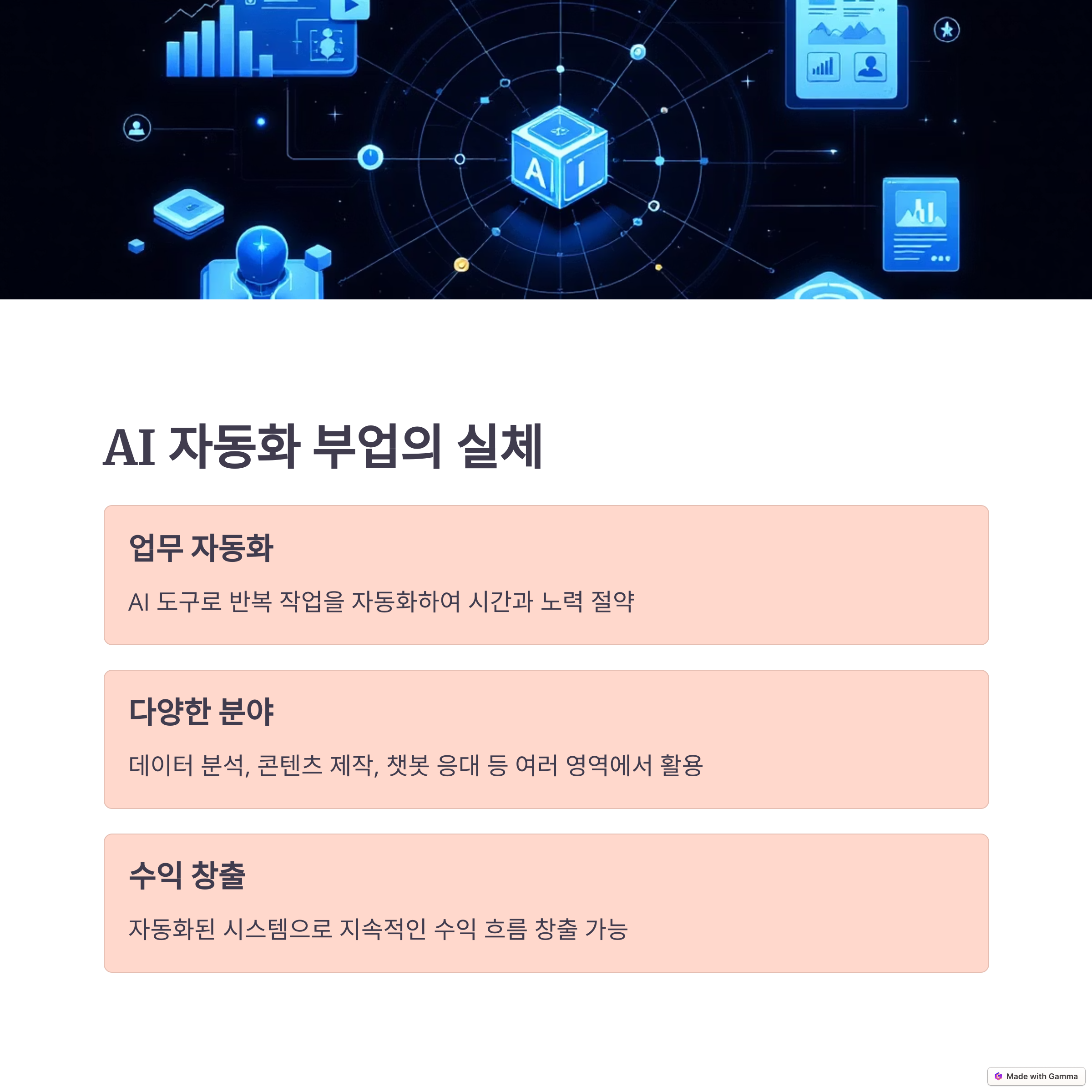 | AI 자동화 부업 | 기술 기반 수익창출 활동으로 자동화된 업무를 활용함 |