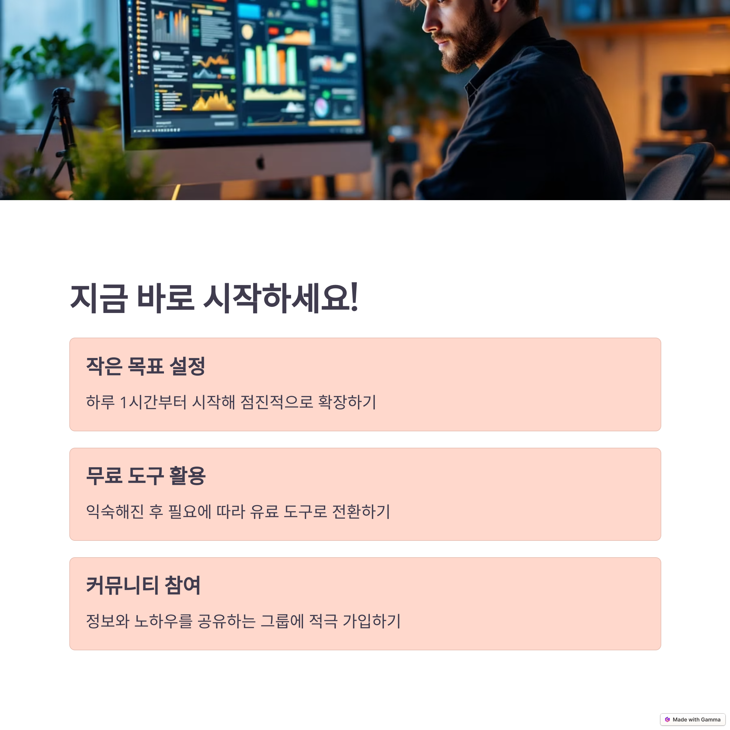 많은 이들이 AI 부업을 시도하지만, 단기간 내 결과를 기대하면서 실망하는 경우도 많습니다. 유튜브나 인스타그램에서 나오는 '하루 5만 원 벌기' 같은 광고성 콘텐츠들은 실제로는 상당한 시간과 노력이 뒷받침되어야 가능한 결과입니다. AI 도구는 분명한 도우미가 될 수 있으나, 모든 것을 자동으로 해결해주지는 않는다는 점을 인식하는 것이 중요합니다.