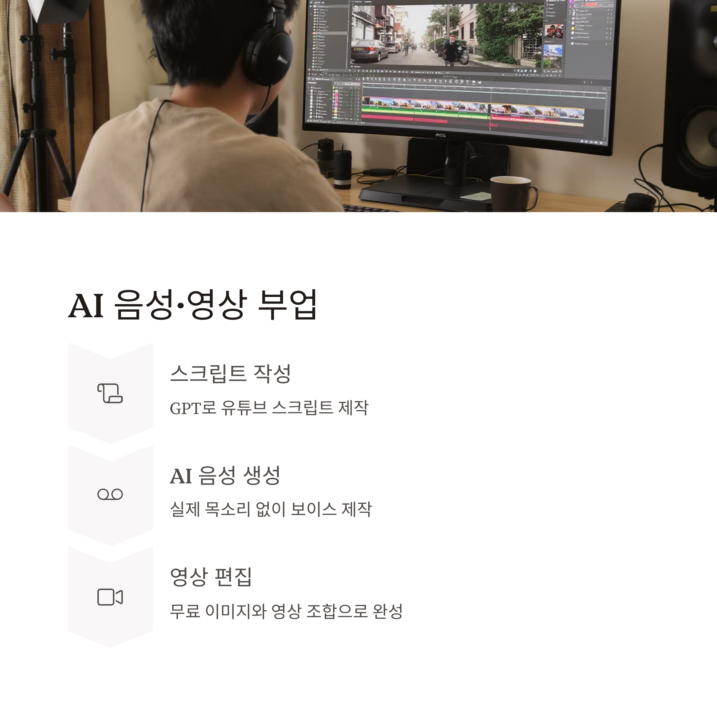 AI 음성으로 녹음하고, 무료 이미지·영상 조합만으로 영상이 완성되죠.