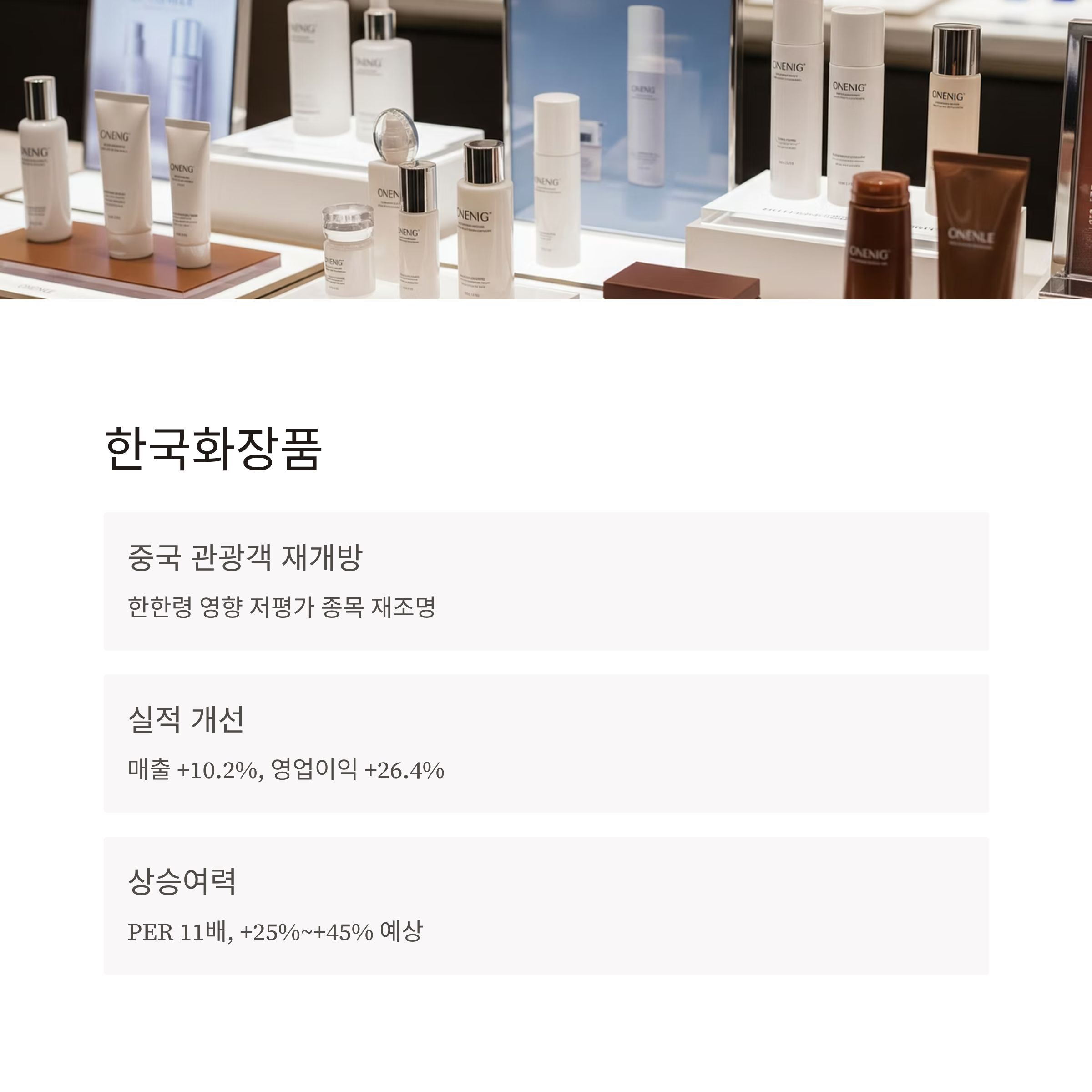 | 한국화장품 | +25%~+45% | 소비재 회복, 중국 관광객 유입 가능성 |