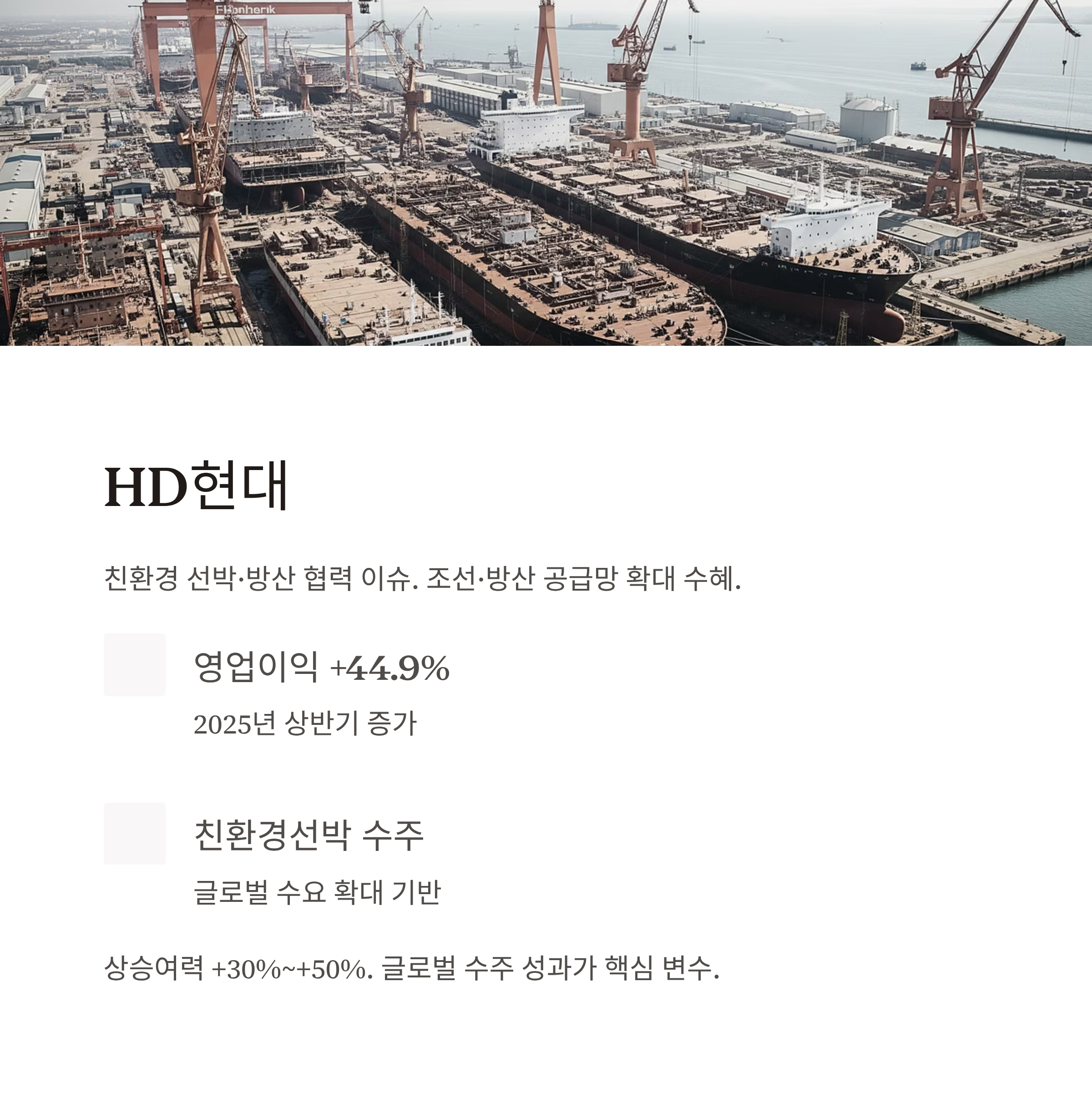 2025년 상반기 영업이익 +44.9% 증가, 글로벌 친환경 선박 수요 확대 등의 흐름은 구조적 성장 기반이 됩니다.