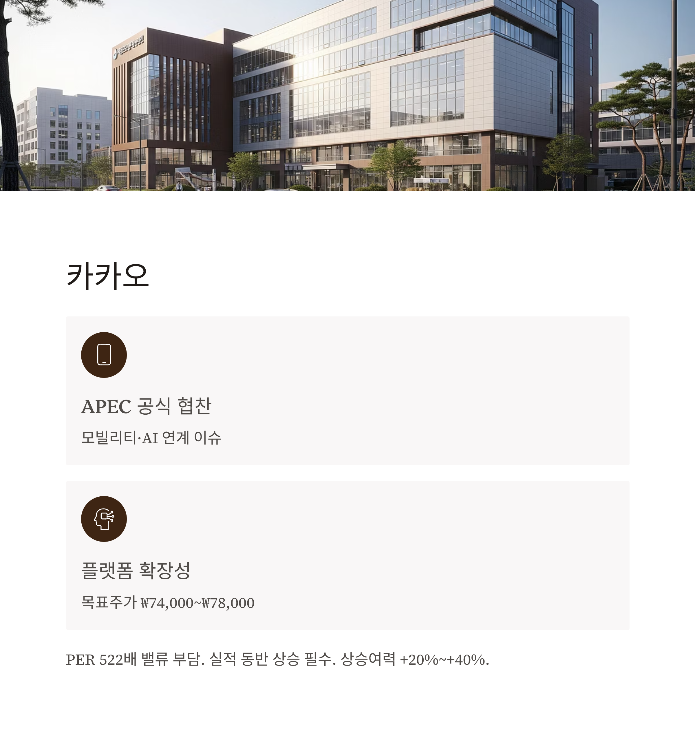 | 카카오 | +20%~+40% | 협찬사 모멘텀, AI·모빌리티 테마 |