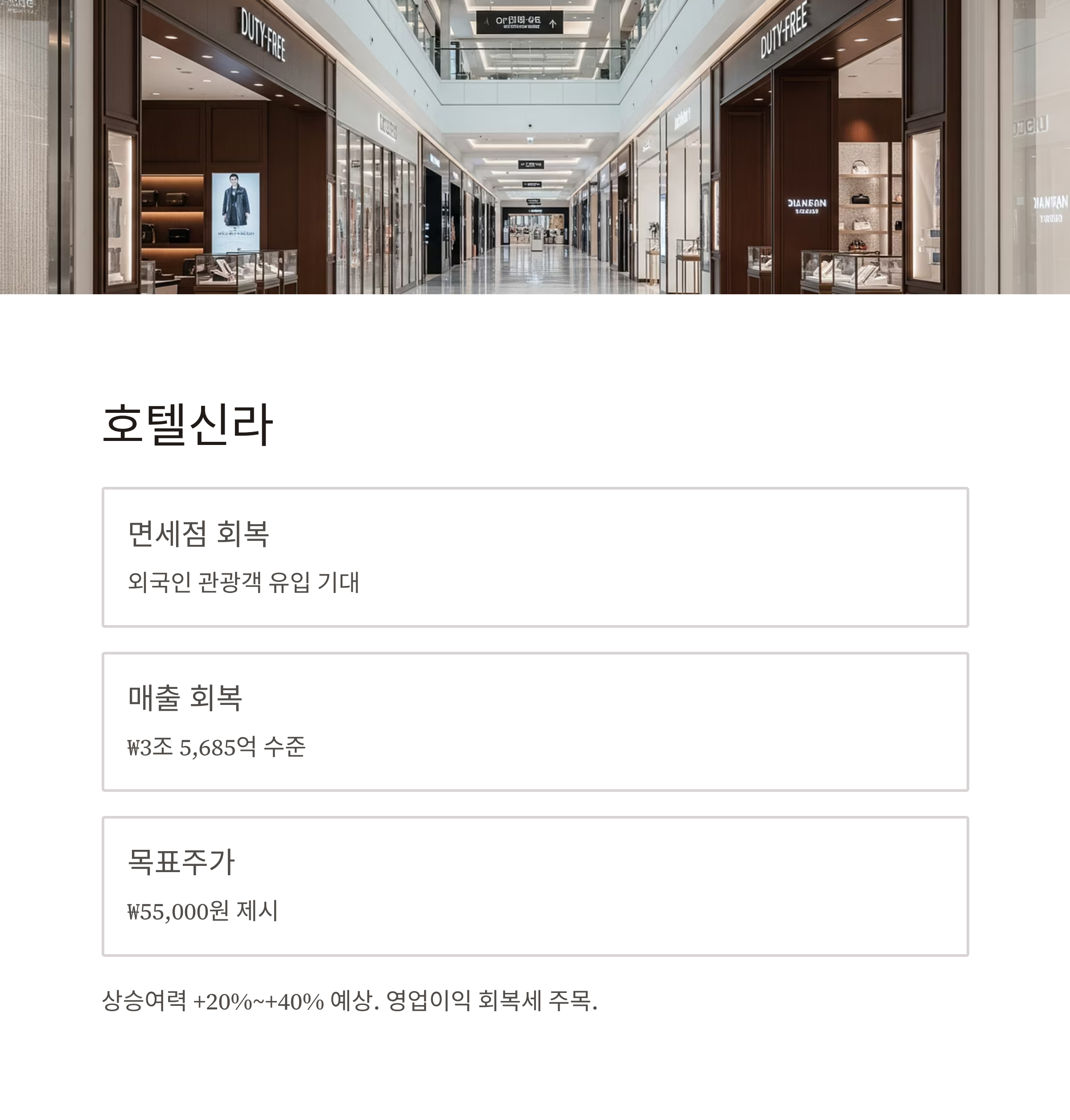 | 호텔신라 | +20%~+40% | 면세점·관광 수요 회복, 수익성 리스크 존재 |
