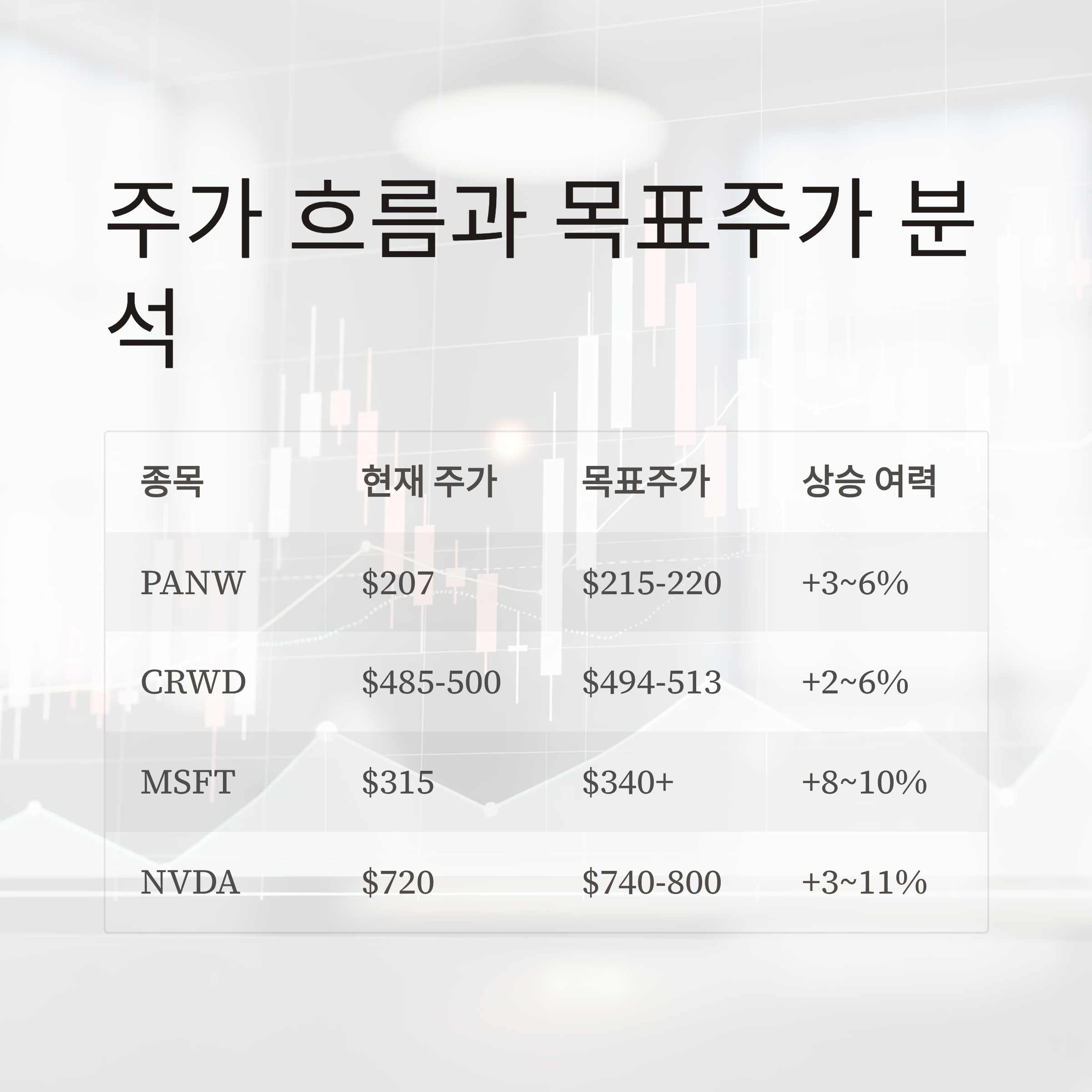 | PANW | 약 US$ 207 | 약 US$ 215 ~ 220 | 약 +3% ~ +6% | 기술 우위 있으나 단기 급등은 제한적 |