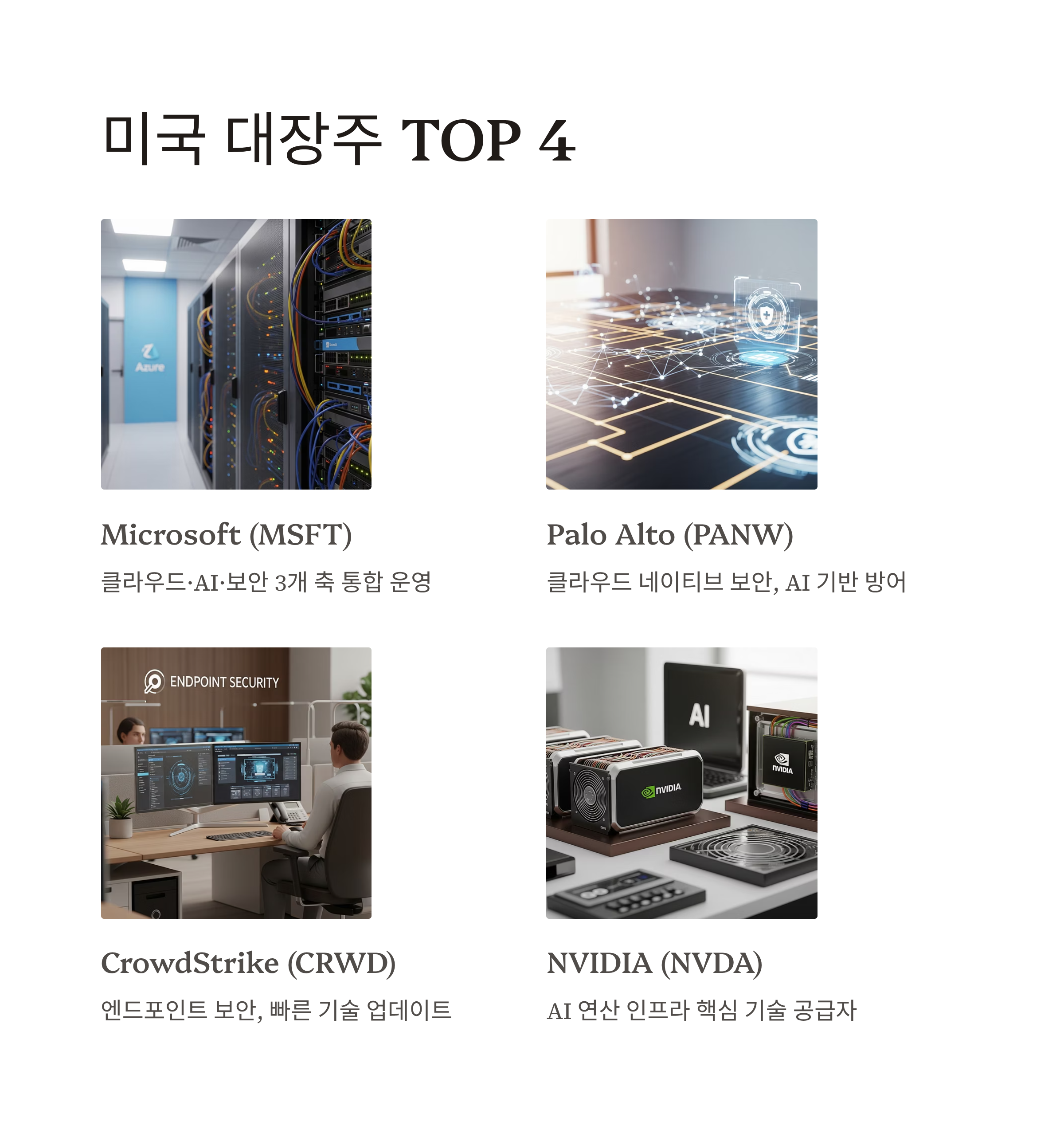 | 보안 솔루션 | PANW, CRWD, FTNT | 클라우드 보안·AI 보안 수요 증가 예상 |