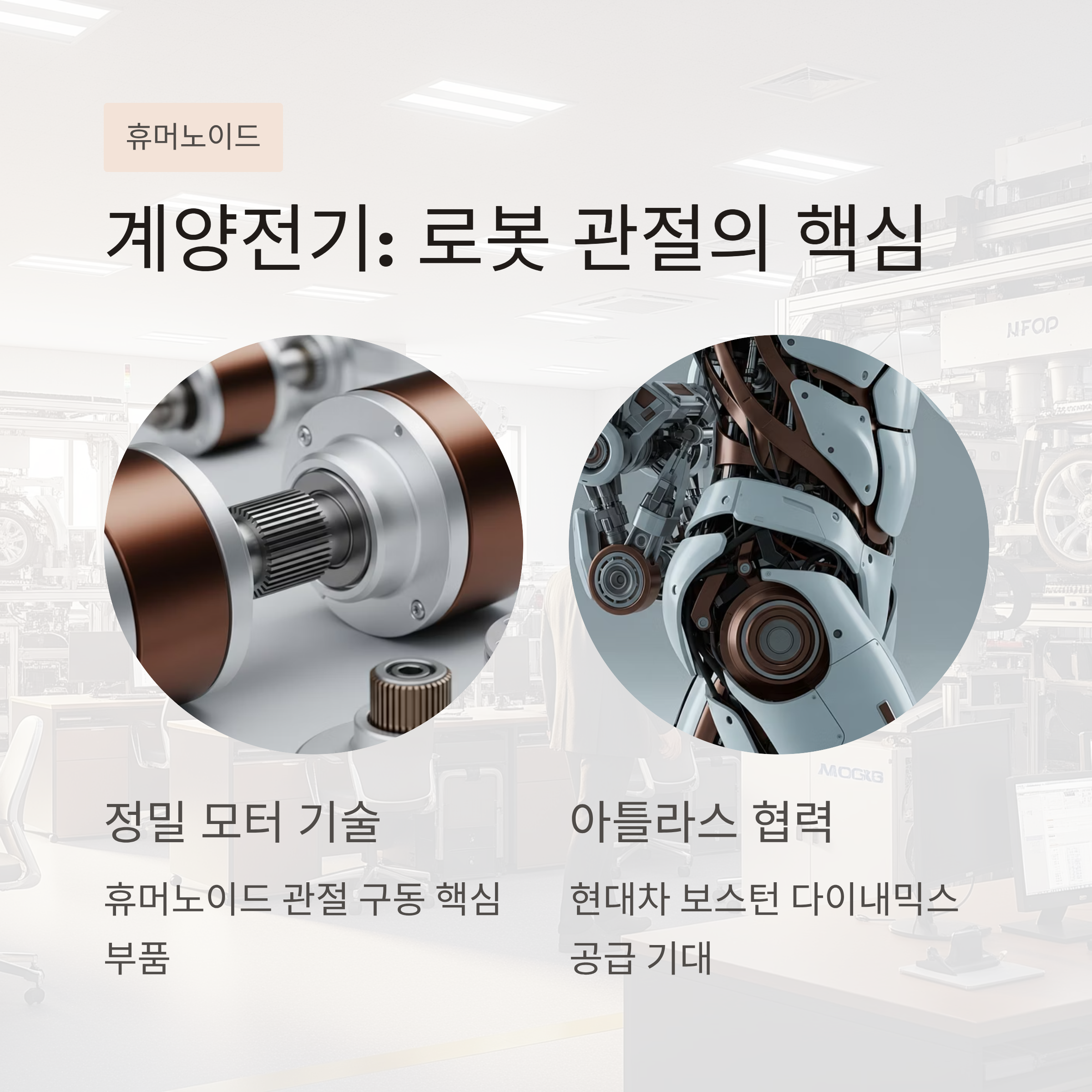 현대차가 보스턴 다이내믹스의 휴머노이드 아틀라스를 전면에 내세우면서 로봇용 모터 기술이 주목받고 있습니다. 계양전기는 정밀 모터 분야에서 오랜 기술력을 보유한 기업으로 휴머노이드 관절 구동 핵심 부품 공급 기대가 커지고 있습니다.