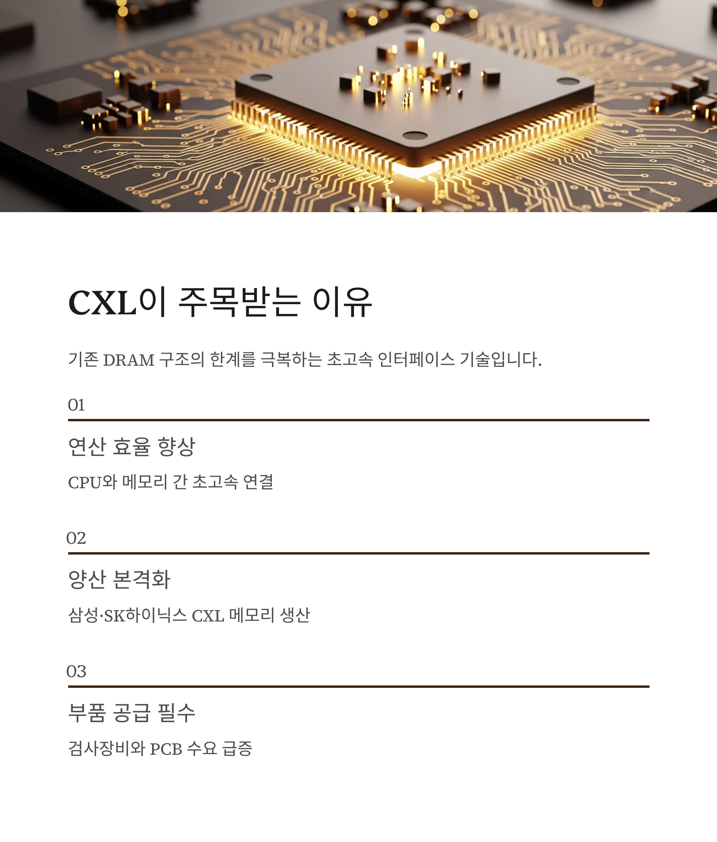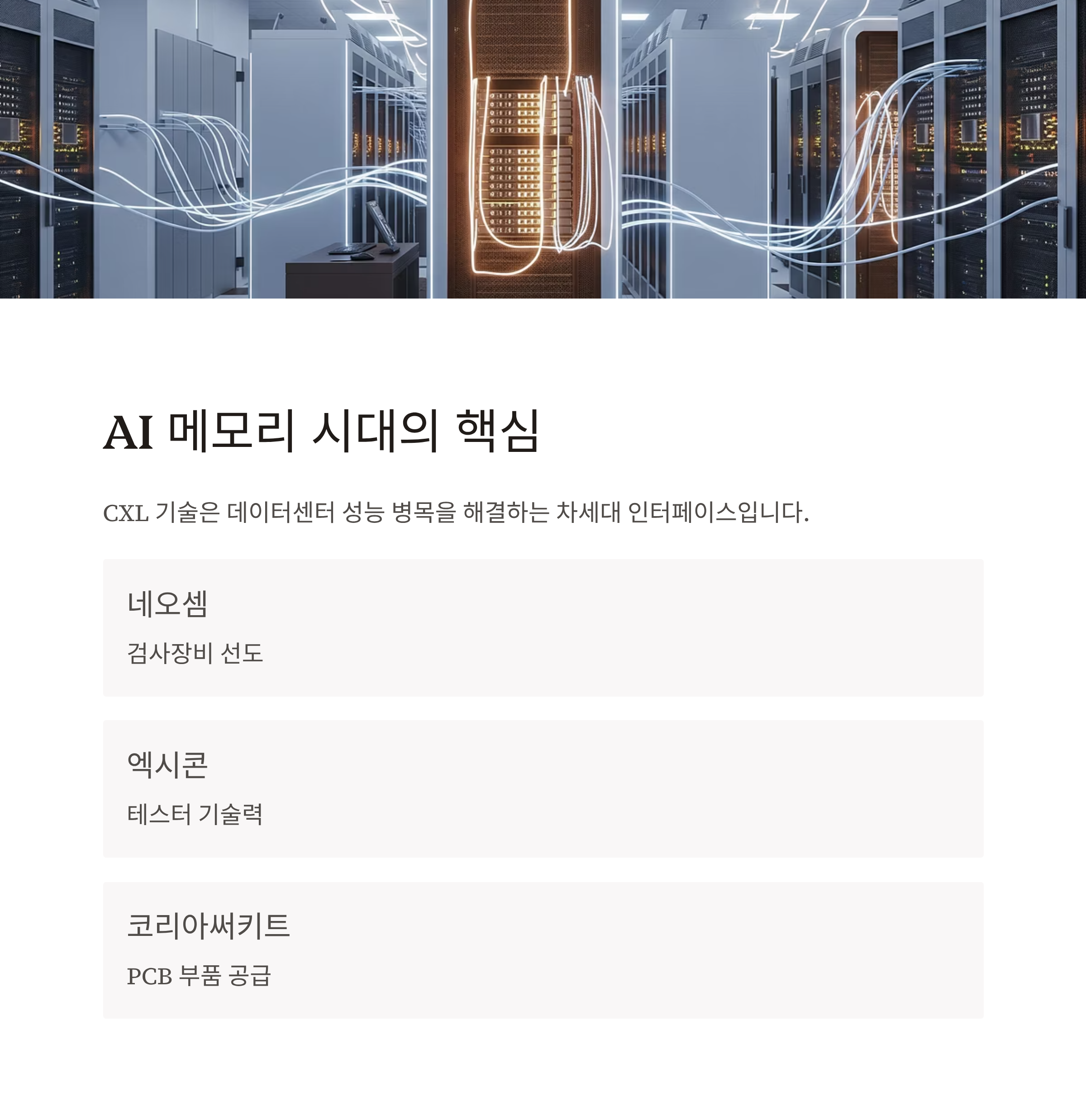 CXL(Compute Express Link) 기술은 AI 반도체 시대의 핵심 연결 고리입니다. 데이터센터와 서버의 성능 병목을 해결할 차세대 인터페이스로 주목받으며, 이에 따라 핵심 부품과 검사장비를 공급하는 기업들이 급부상하고 있습니다. 특히 네오셈, 엑시콘, 코리아써키트는 CXL 수혜 관련주로 꼽히며 투자자들의 관심을 받고 있는데요. 이 세 종목의 현재 상황과 투자 전략을 분석해보겠습니다.