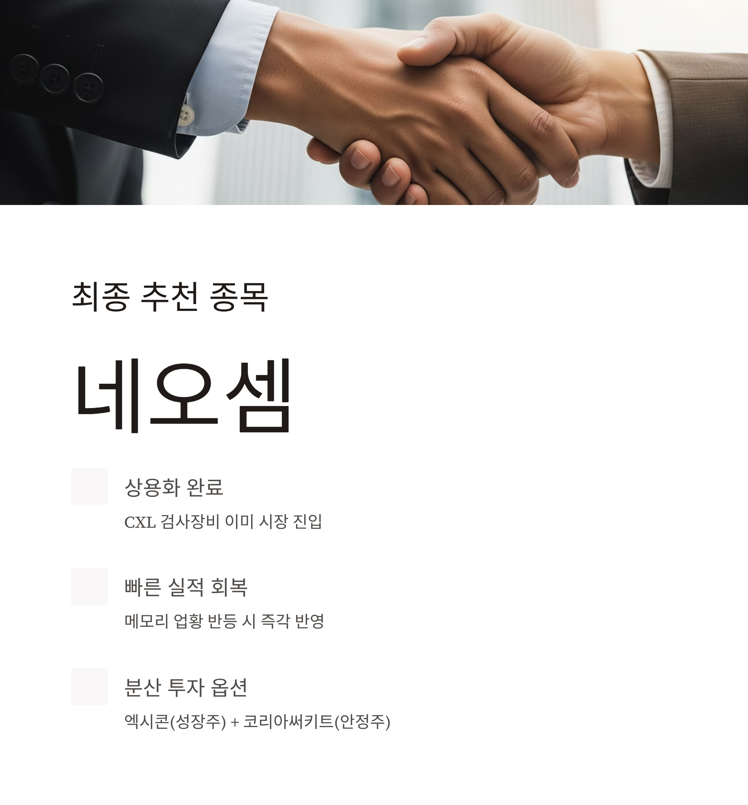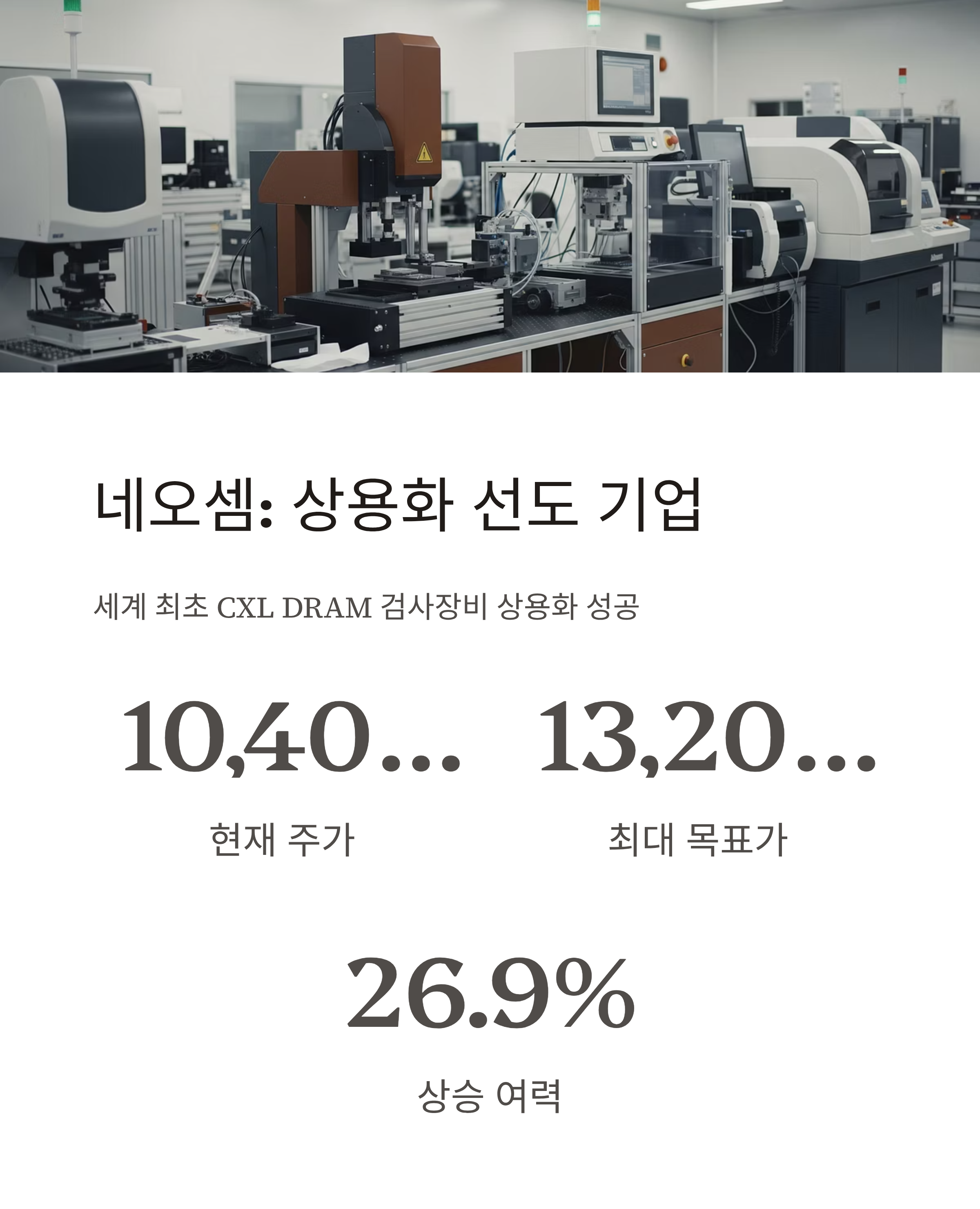 그리고 이 기술이 상용화되기 위해선, 검사장비와 PCB 같은 고부가 부품 공급이 필수입니다. 바로 여기서 네오셈, 엑시콘, 코리아써키트가 주목받는 이유죠.